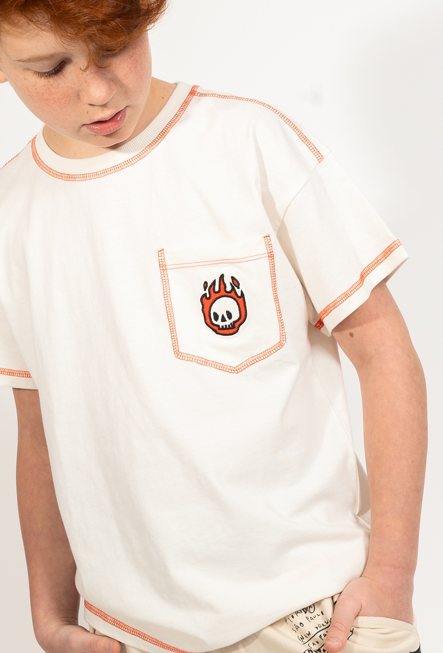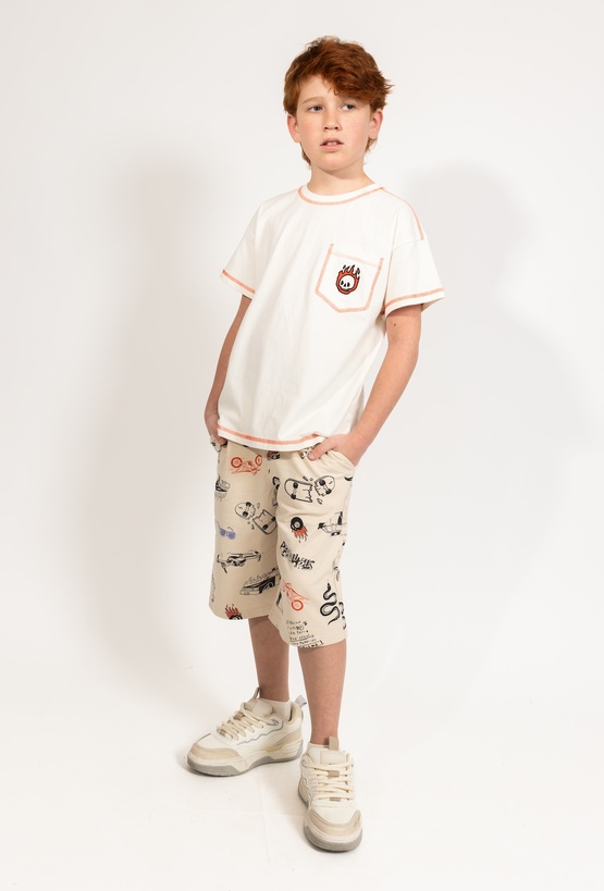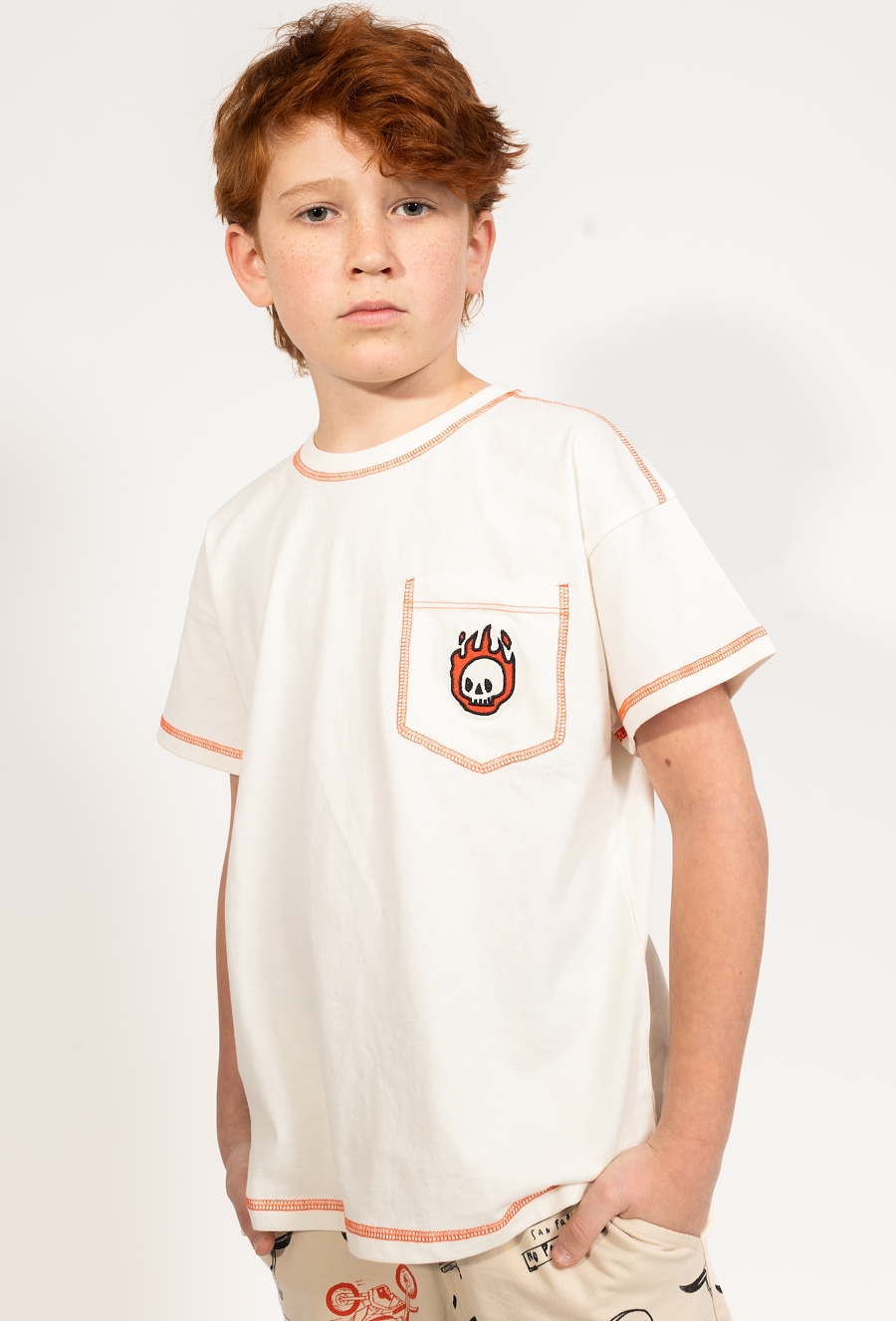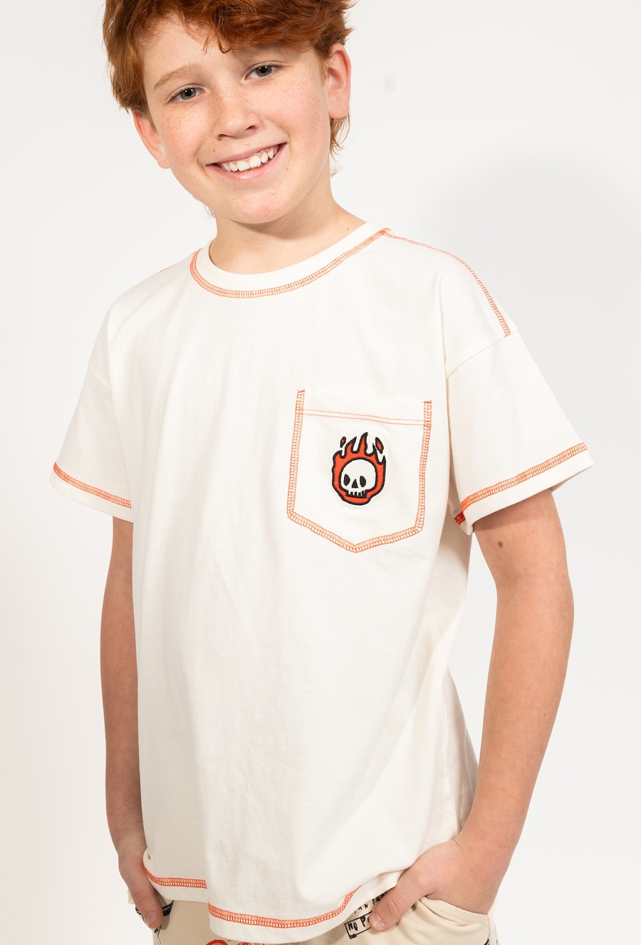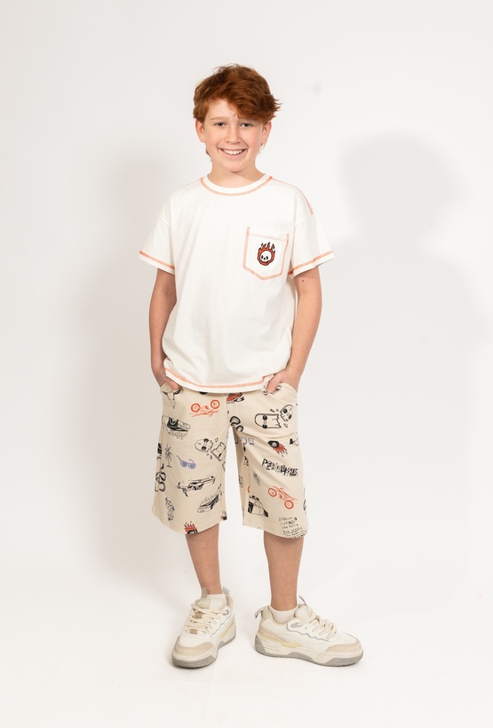 Stylowa koszulka oversize dla chłopca w kolorze ecru, uszyta w 100% z bawełny. Luźny krój zapewnia swobodę ruchów, a kontrastowe obszycia dodają całości charakteru. Na przodzie znajduje się praktyczna kieszonka z haftowaną aplikacją, która wyróżnia ten t-shirt wśród klasycznych modeli.