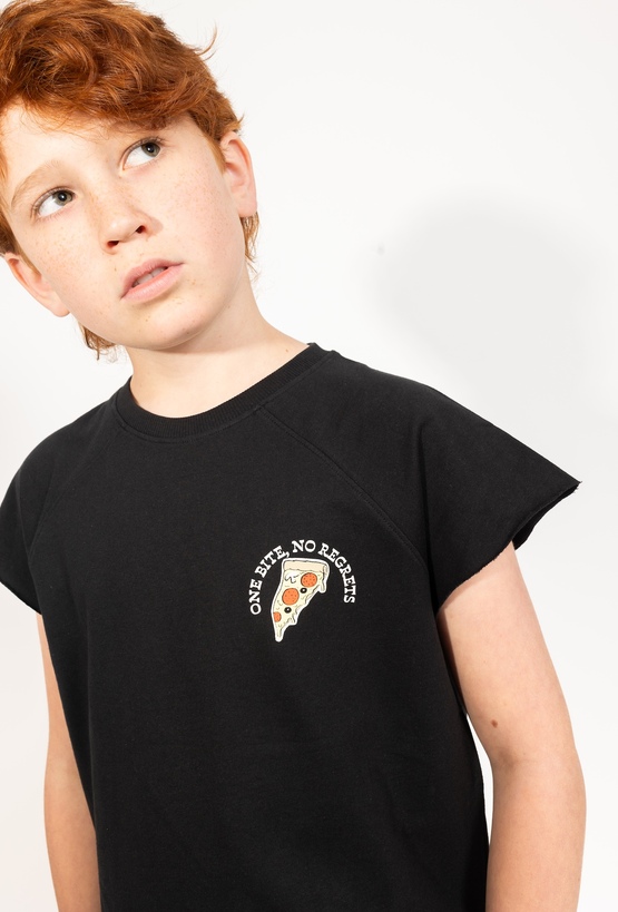 Stylowy t-shirt z charakterem. Ta czarna koszulka 51015 wykonana z grubszej, mięsistej bawełny, zapewnia wyjątkowy komfort i trwałość. Krój regular z raglanowymi rękawami oraz ozdobne rozcięcia w bocznych szwach nadają jej nowoczesnego wyglądu. Zabawne printy z motywem pizzy z przodu oraz ramenu na plecach sprawiają, że koszulka wyróżnia się z tłumu i jest świetnym wyborem do codziennych, ciekawych stylizacji.