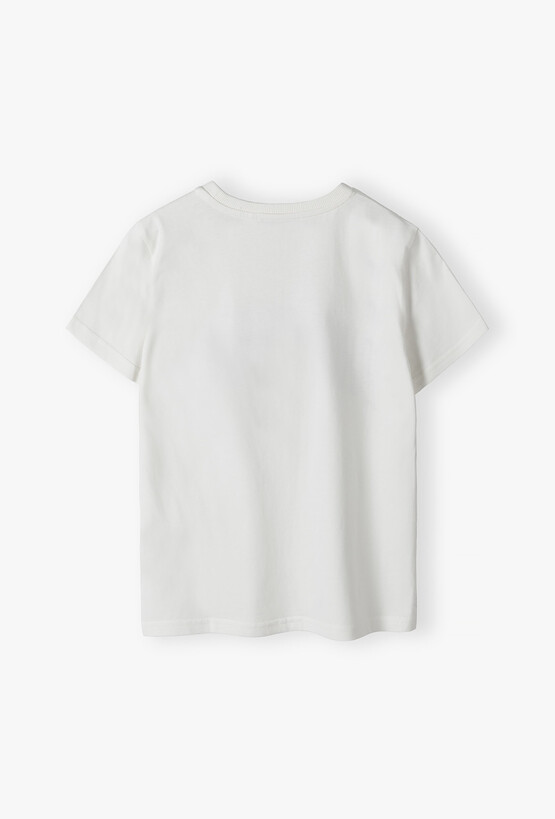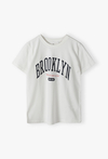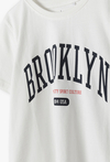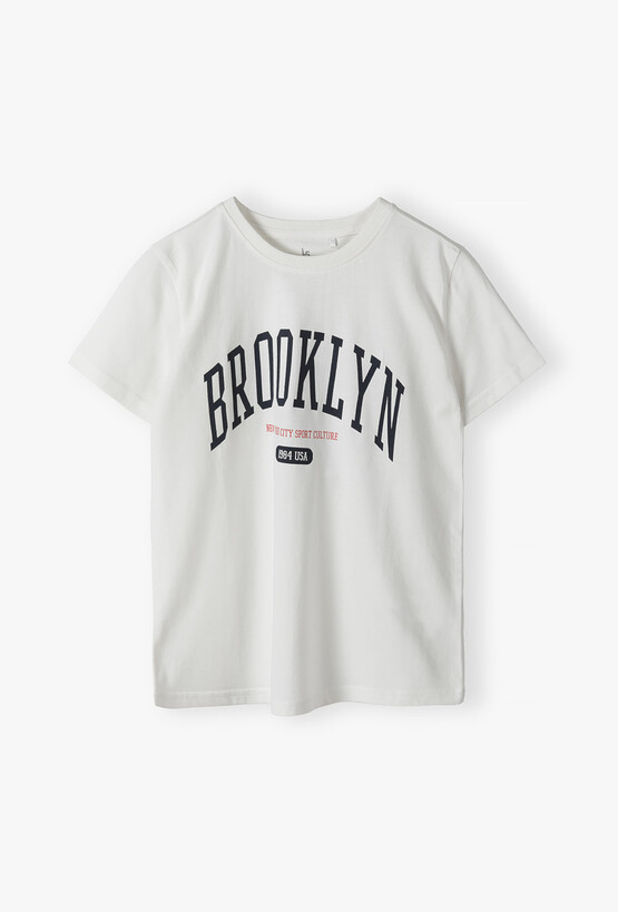 Postaw na klasykę w nowoczesnym, amerykańskim wydaniu! Ta biała koszulka z krótkim rękawem to idealna propozycja dla chłopców, którzy cenią sobie swobodny styl z nutą retro. Dzięki uniwersalnej kolorystyce i wyrazistej grafice w stylu uniwersyteckim, T-shirt ten stanie się ulubionym elementem codziennych stylizacji do szkoły czy na spotkania z kolegami. Na przodzie znajduje się duży, czarny napis „BROOKLYN” ułożony w charakterystyczny łuk. Całość dopełniają mniejsze detale: czerwony napis „NEW YORK CITY SPORT CULTURE” oraz czarna plakietka „1984 USA”, które nadają koszulce autentycznego, sportowego sznytu. Śnieżnobiały kolor sprawia, że T-shirt pasuje do wszystkiego – od klasycznych niebieskich jeansów, przez szare dresy, aż po neonowe szorty.