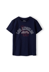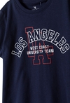 Postaw na modny, amerykański look w codziennym wydaniu! Ta granatowa koszulka z krótkim rękawem to idealna propozycja dla chłopców, którzy lubią sportowy styl z nutą miejskiego luzu. Dzięki klasycznej kolorystyce i wyrazistej grafice, T-shirt ten stanie się bazą wielu udanych stylizacji do szkoły, na spotkania z kolegami czy popołudniowy trening. Na przodzie znajduje się duży, biały napis „LOS ANGELES” oraz hasło „WEST COAST UNIVERSITY TEAM”. Konturowe litery „LA” w kolorze czerwonym dodają grafice głębi i nawiązują do klasycznego stylu varsity. Głęboki odcień granatu to jeden z najbardziej praktycznych kolorów – świetnie komponuje się z szarymi dresami, klasycznymi jeansami czy neonowymi szortami.