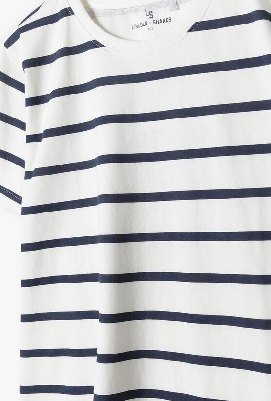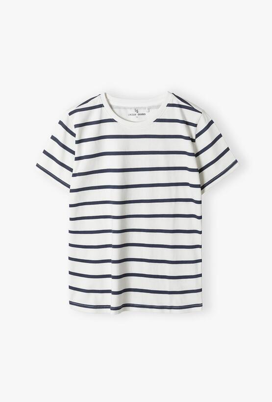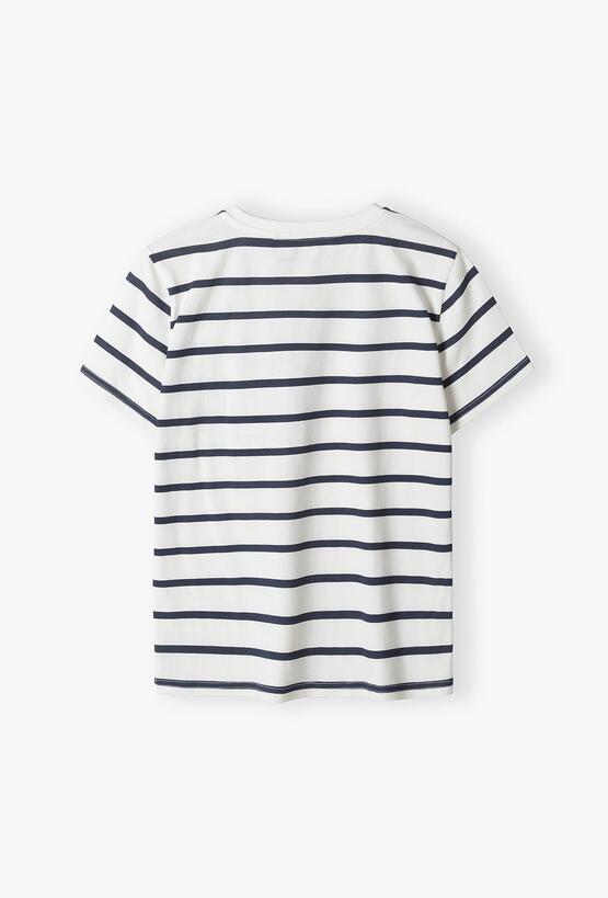 Postaw na styl, który nigdy nie wychodzi z mody! Ten biały T-shirt w regularne, granatowe paski to absolutny fundament chłopięcej garderoby. Dzięki połączeniu tradycyjnego wzoru marynarskiego z nowoczesnym, komfortowym krojem, koszulka ta sprawdzi się w każdej sytuacji – od rodzinnego spaceru po aktywny dzień w szkole. Równomierne, poziome paski w kolorze głębokiego granatu na białym tle nadają ubraniu świeżości i elegancji. To motyw, który z łatwością dopasuje się do reszty ubrań w szafie. Ten bawełniany T-shirt to gwarancja schludnego wyglądu i najwyższego komfortu, który sprosta wymaganiom każdego nastolatka.
