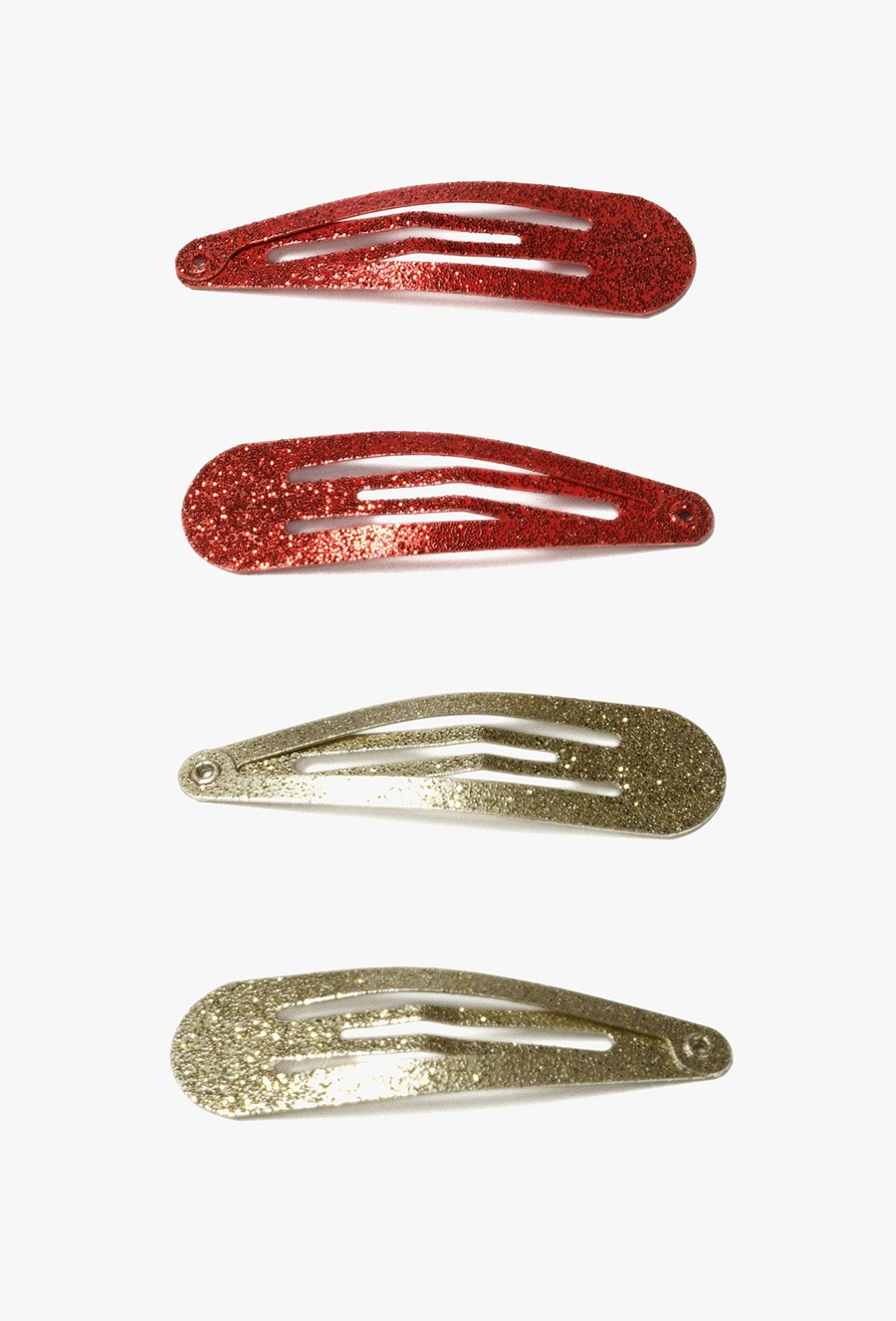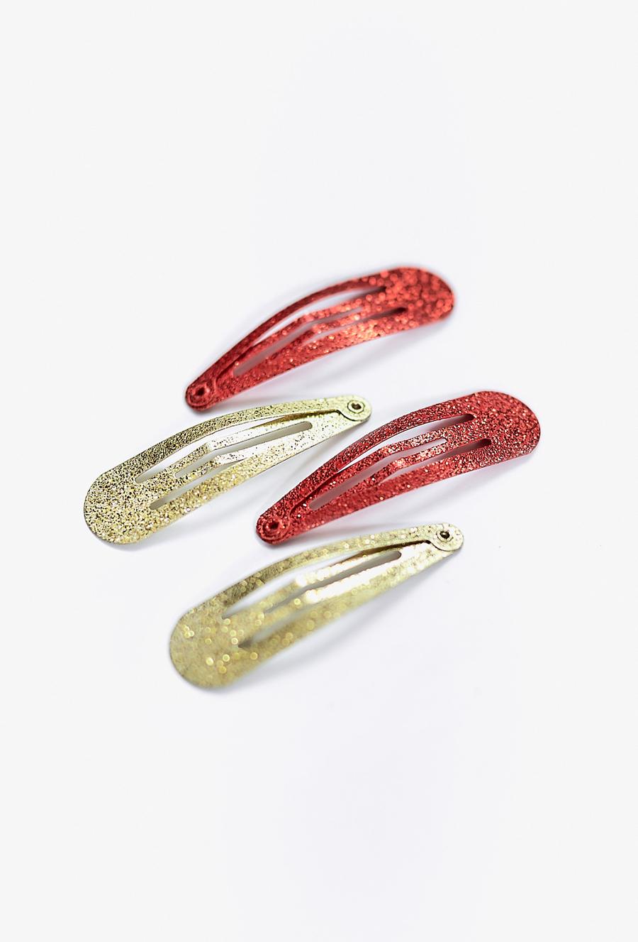 Zestaw klasycznych brokatowych spinek typu "klik-klak" w dwóch kolorach: czerwonym i złotym. Każdy zestaw zawiera 4 sztuki – po 2 w każdym kolorze. Idealne do świątecznych stylizacji, ale także na co dzień jako dziewczęcy akcent fryzury. Spinki są lekkie i łatwe w zapinaniu – dobrze trzymają włosy i nie wyrywają ich przy zdejmowaniu. Subtelny brokat nadaje im wyjątkowego uroku i sprawia, że każda fryzura będzie wyglądała efektownie.