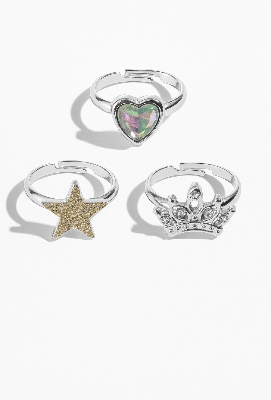 Zestaw 3 regulowanych pierścionków to idealna propozycja dla małych miłośniczek biżuterii. W komplecie znajdują się trzy różne wzory: kolorowe serduszko, złocista gwiazdka oraz korona ozdobiona błyszczącymi kamyczkami. Dzięki regulowanemu rozmiarowi pierścionki łatwo dopasowują się do małych paluszków, zapewniając wygodę noszenia. Świetny pomysł na prezent, który doda stylizacji uroku i bajkowego charakteru.
