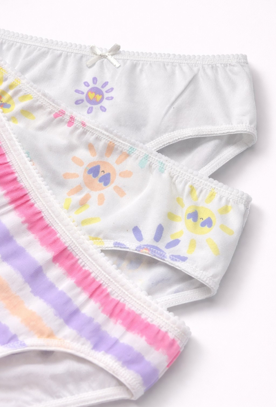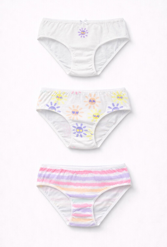 3-pak majtek dziewczęcych bawełnianych to praktyczny zestaw bielizny na co dzień, który łączy wygodę z uroczym, dziecięcym wzornictwem. W komplecie znajdują się trzy pary: gładkie białe z delikatnym nadrukiem, białe z kolorowym printem słoneczek oraz model w pastelowe paski. Miękka bawełna zapewnia komfort noszenia – w przedszkolu, szkole i podczas zabawy. Klasyczny krój dobrze dopasowuje się do sylwetki, a elastyczne wykończenia pomagają utrzymać wygodę bez nadmiernego ucisku. Subtelna kokardka przy pasie dodaje całości dziewczęcego uroku.