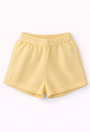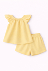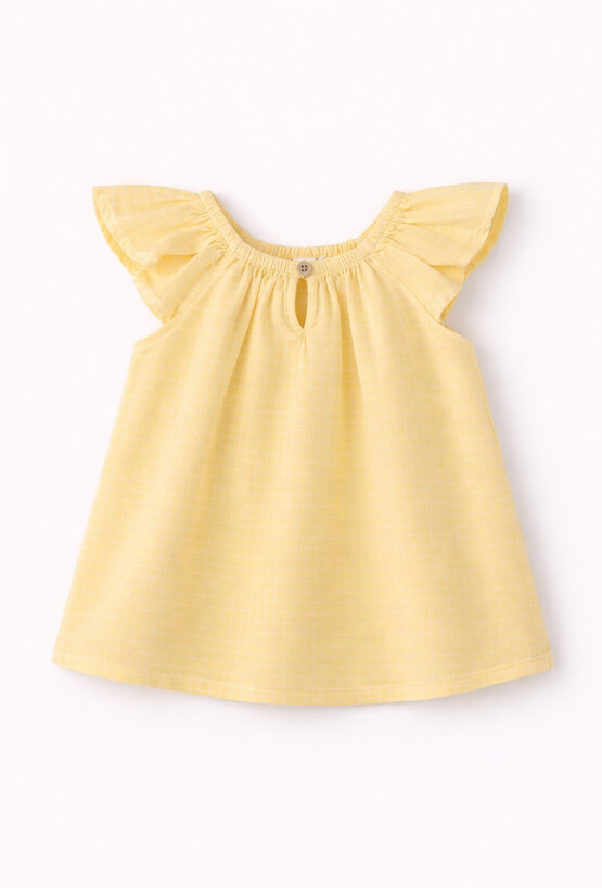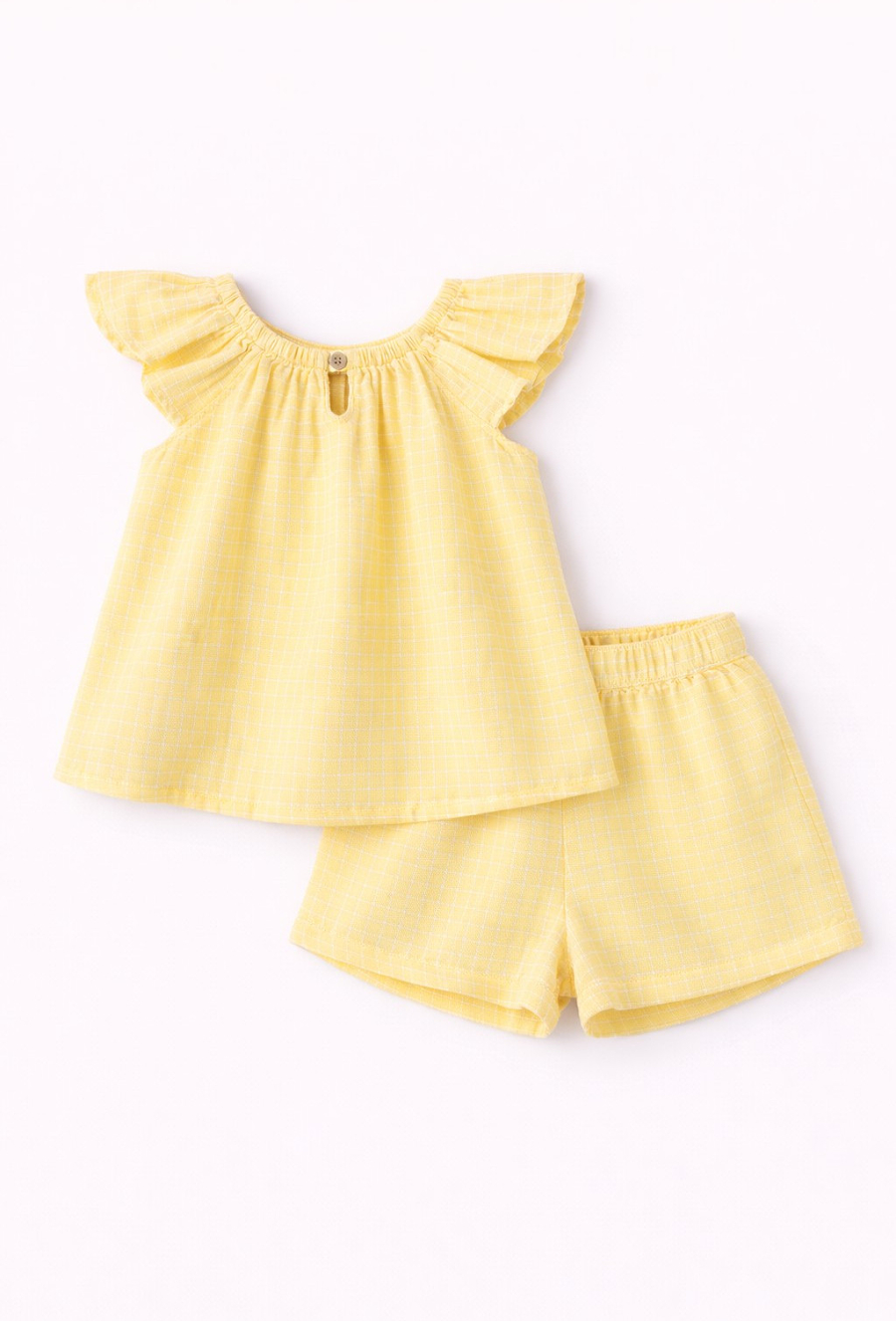 Słoneczny komplet niemowlęcy z delikatnej tkaniny. Zapewnij swojej córeczce radosny i stylowy wygląd w letnie dni. Ten dwuczęściowy zestaw w kolorze pastelowej żółci łączy w sobie dziewczęcą elegancję z pełną wygodą, idealną do codziennych zabaw i rodzinnych spacerów. Wykonana z przewiewnej tkaniny w subtelną, białą kratkę. Model posiada szerokie falbanki zamiast rękawów, które nadają mu lekkości. Okrągły dekolt z delikatnym marszczeniem i ozdobnym rozcięciem zapinanym na guzik z przodu ułatwia zakładanie ubranka. Krótkie spodenki wykonane z tego samego materiału w kratkę. Elastyczna guma w pasie zapewnia idealne dopasowanie bez uciskania brzuszka dziecka, a swobodny krój nogawek dba o komfort podczas ruchu.