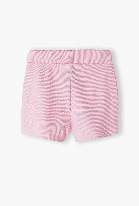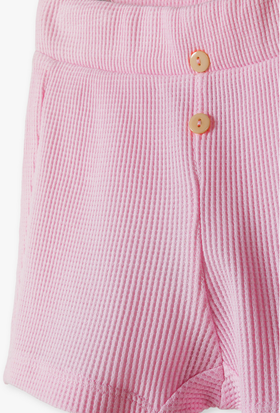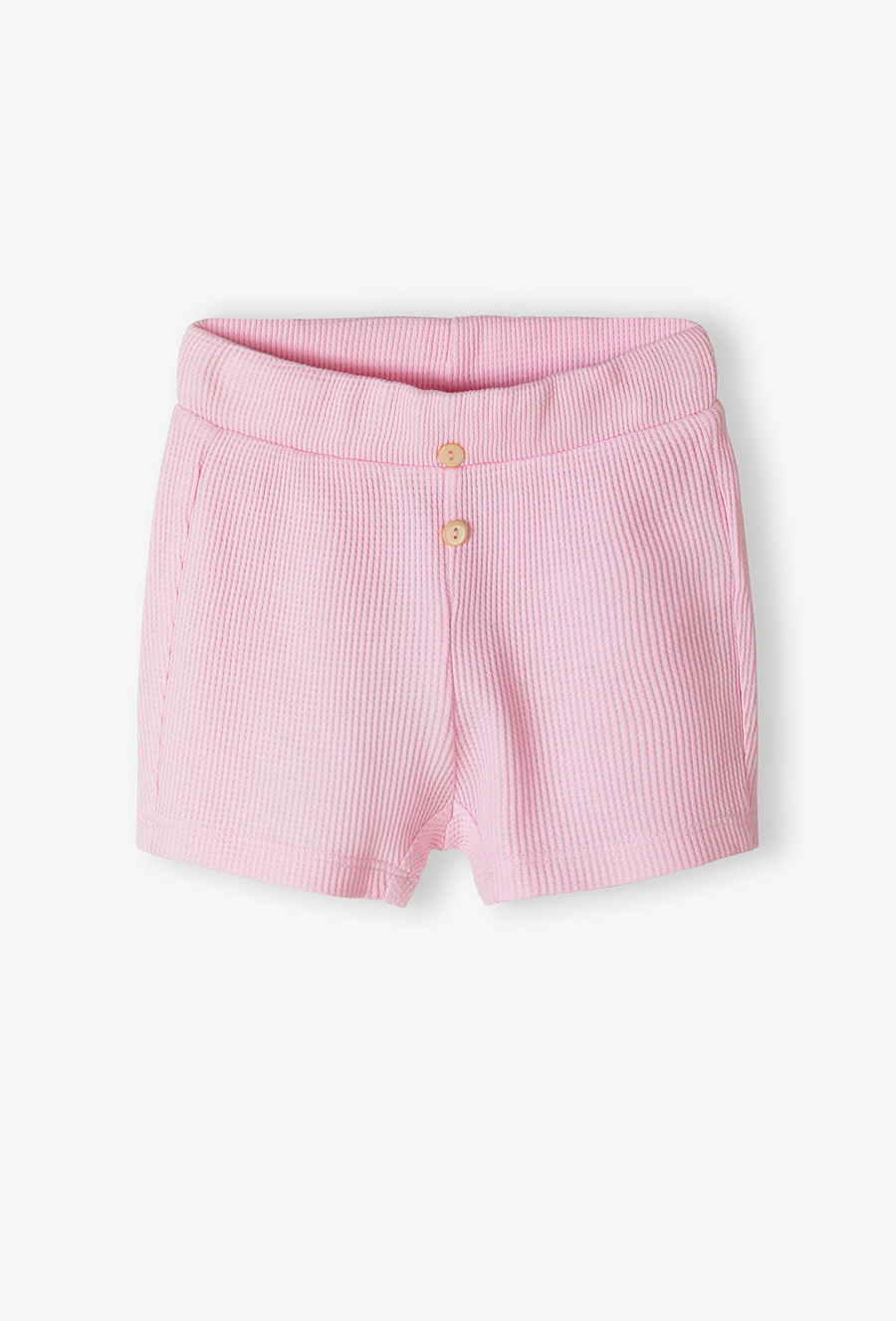 Postaw na połączenie klasycznego koloru z nowoczesną strukturą materiału! Te różowe szorty to propozycja dla rodziców, którzy szukają dla swojej córeczki ubranek typu basic z „tym czymś”. Dzięki szlachetnemu splotowi i dbałości o detale, spodenki te są równie stylowe, co komfortowe. Przód spodenek zdobią dwa pionowo rozmieszczone guziczki w kontrastowym, kremowym kolorze. To subtelny akcent, który nadaje szortom rustykalnego charakteru. Fason z prostymi nogawkami został zaprojektowany tak, aby komfortowo mieścić pieluszkę i zapewniać dziecku pełną swobodę ruchów podczas zabawy czy raczkowania. Te różowe spodenki to doskonała baza do wielu stylizacji. Świetnie komponują się z białym body z falbanką, kwiatowym T-shirtem lub muślinową tuniką.