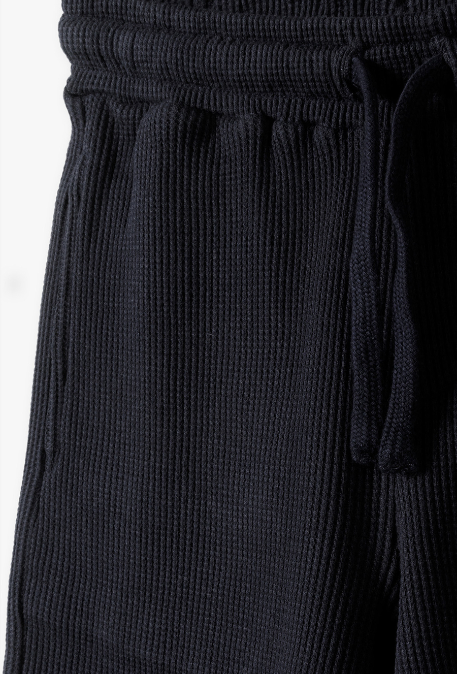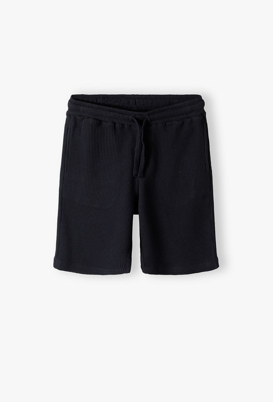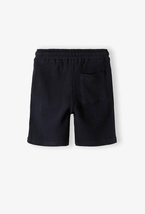 Szukasz bazy letniej garderoby, która wyróżnia się na tle zwykłych dresów? Te czarne szorty to połączenie minimalistycznego designu z niezwykle modną strukturą materiału. Dzięki swojej uniwersalności i trwałości, staną się ulubionym elementem stylizacji każdego aktywnego chłopca. Szeroka guma w pasie zapewnia stabilność i wygodę, a dodatkowe troczki pozwalają na idealne dopasowanie spodenek do sylwetki, zapobiegając ich zsuwaniu się podczas biegania czy jazdy na rowerze. Długość do połowy uda zapewnia optymalną osłonę i pełną swobodę ruchów. To idealny fason na wakacyjne wyjazdy, lekcje WF-u czy codzienne zabawy na świeżym powietrzu.