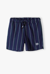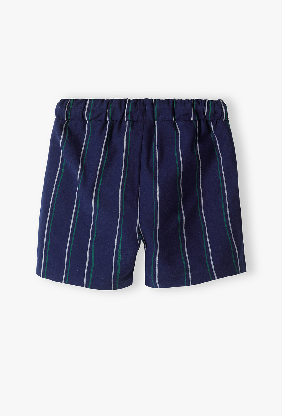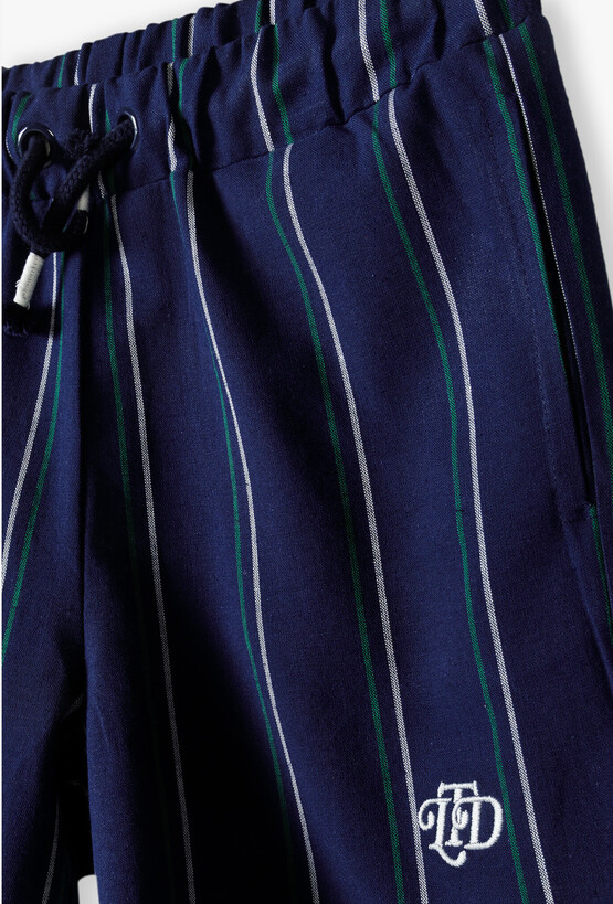 Eleganckie szorty w pionowe paski – szyk i wygoda dla małego dżentelmena. Dodaj odrobinę klasycznej elegancji do letniej garderoby swojego dziecka! Te granatowe szorty o długości 1/3 to idealne połączenie wizytowego stylu z komfortem, którego potrzebuje każdy aktywny chłopiec podczas letnich uroczystości czy rodzinnych obiadów. Na lewej nogawce znajduje się precyzyjny, biały haft z logo, który podkreśla unikalny charakter ubrania z linii Limited Edition. Klasyczny granat został przełamany pionowymi, cienkimi paskami w kolorze białym i zielonym, co optycznie wysmukla sylwetkę i nadaje spodenkom prestiżowego wyglądu. Elastyczna guma w pasie zapewnia swobodę ruchów, a ciemnogranatowy, gruby sznurek z białymi zakończeniami pozwala na idealne dopasowanie spodenek do sylwetki dziecka. Te eleganckie bermudy stworzą doskonały zestaw z białą koszulą lub błękitną koszulką polo, tworząc gotowy look na każdą ważną okazję.