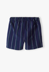 Dodaj odrobinę klasycznej elegancji do letniej garderoby swojego dziecka! Te granatowe szorty o długości 1/3 to idealne połączenie wizytowego stylu z komfortem, którego potrzebuje każdy aktywny chłopiec podczas letnich uroczystości czy rodzinnych obiadów. Klasyczny granat został przełamany pionowymi, cienkimi paskami w kolorze białym i zielonym, co optycznie wysmukla sylwetkę i nadaje spodenkom prestiżowego wyglądu. Na lewej nogawce znajduje się precyzyjny, biały haft z logo, który podkreśla unikalny charakter ubrania z linii Limited Edition. Elastyczna guma w pasie zapewnia swobodę ruchów, a ciemnogranatowy, gruby sznurek z białymi zakończeniami pozwala na idealne dopasowanie spodenek do sylwetki dziecka.
