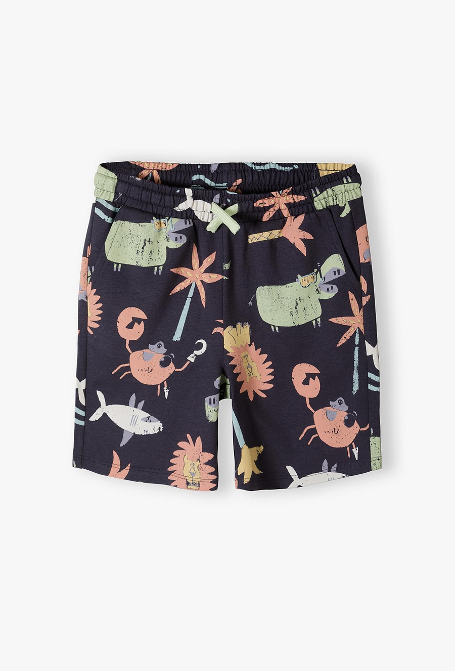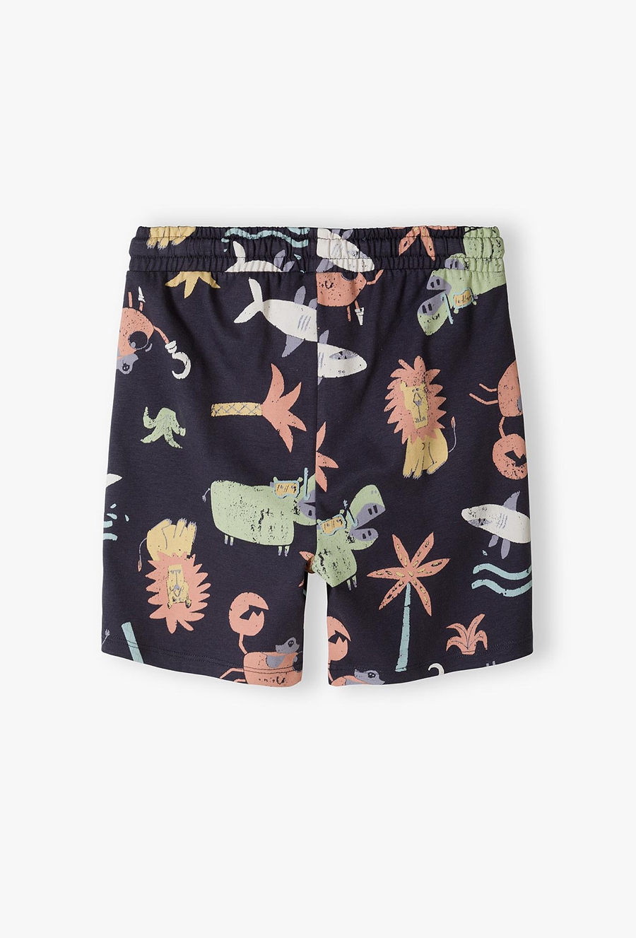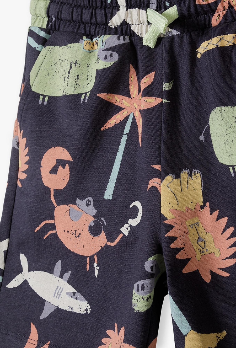 Przygotuj swojego małego odkrywcę na wakacyjne wyzwania! Te granatowe szorty dresowe to idealne połączenie sportowej wygody z radosnym, dziecięcym designem. Dzięki miękkiej dzianinie i zabawnym grafikom, spodenki te staną się ulubionym elementem garderoby podczas zabaw w ogrodzie, na placu zabaw czy wakacyjnych wyjazdów. Spodenki pokryte są kolorowymi grafikami przedstawiającymi lwy, kraby, rekiny oraz palmy. Motywy safari i morskie w odcieniach zieleni, pomarańczu i błękitu nadają im unikalnego, radosnego charakteru. Klasyczny fason szortów dresowych zapewnia pełną swobodę ruchów, co jest kluczowe dla aktywnego malucha. Spodenki posiadają również praktyczne kieszenie boczne.