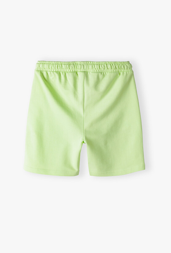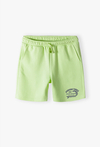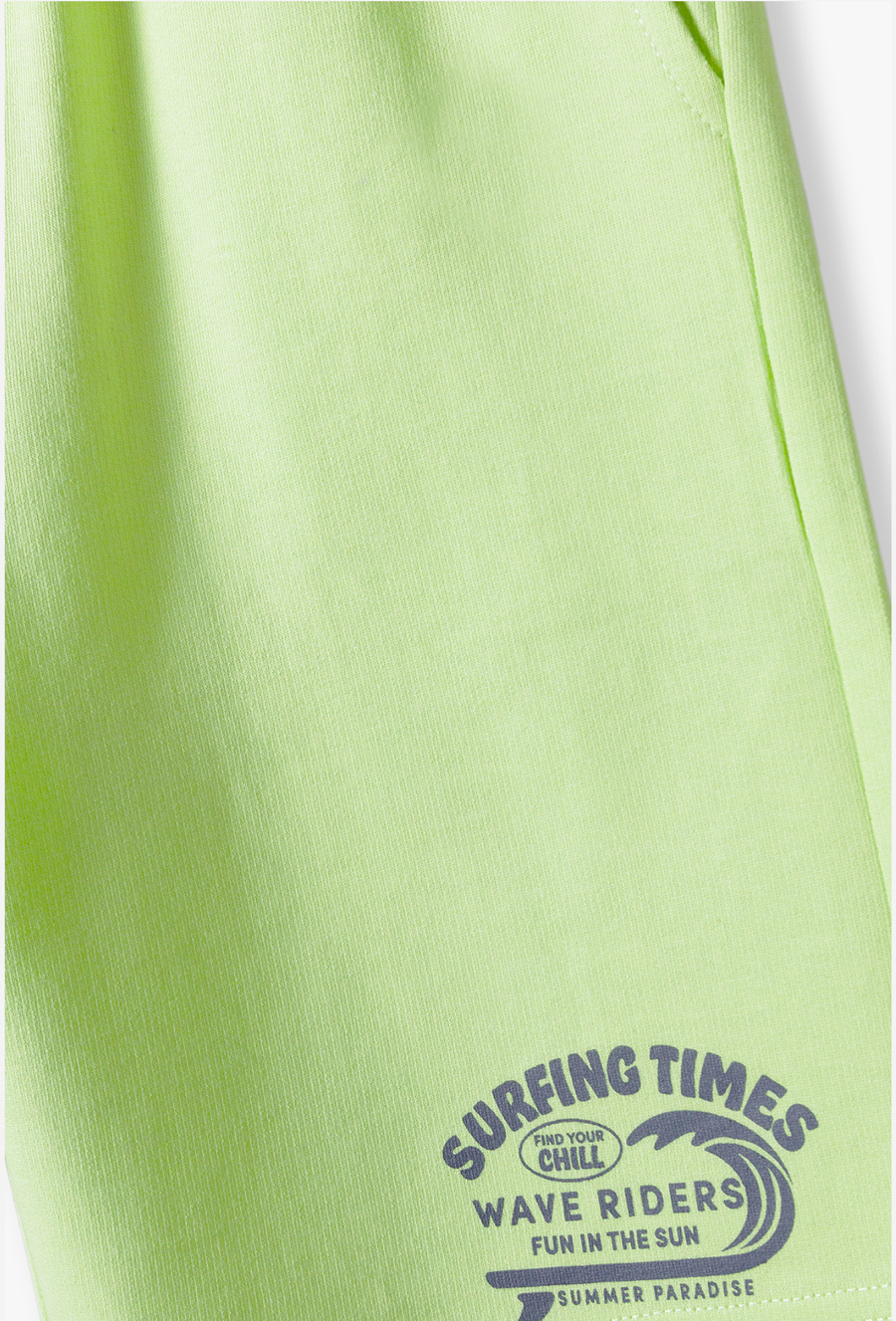 Poczuj letni luz w najlepszym wydaniu! Te limonkowozielone szorty o długości 1/2 to idealna propozycja dla chłopca, który kocha słońce, wodne przygody i sportową wygodę. Energetyczny kolor i surferska grafika sprawią, że będą to ulubione spodenki Twojego dziecka w tym sezonie. Na lewej nogawce znajduje się stylowa grafika w kolorze grafitowym z motywem fali oraz napisami „Surfing Times”, „Wave Riders” i „Summer Paradise”. Nadruk nadaje szortom unikalnego, surferskiego charakteru. Jasnozielony, świeży kolor świetnie komponuje się z białym T-shirtem lub grafitowym bezrękawnikiem, tworząc modny, wakacyjny look.