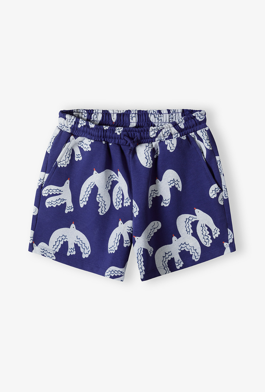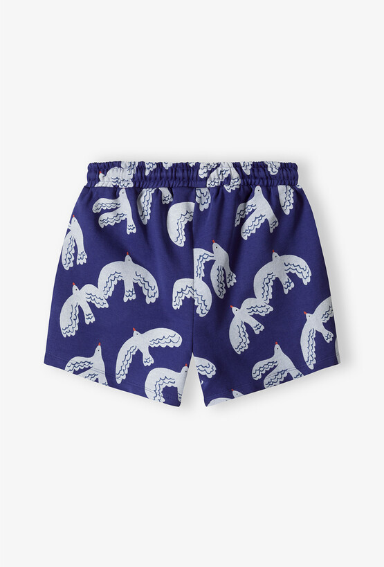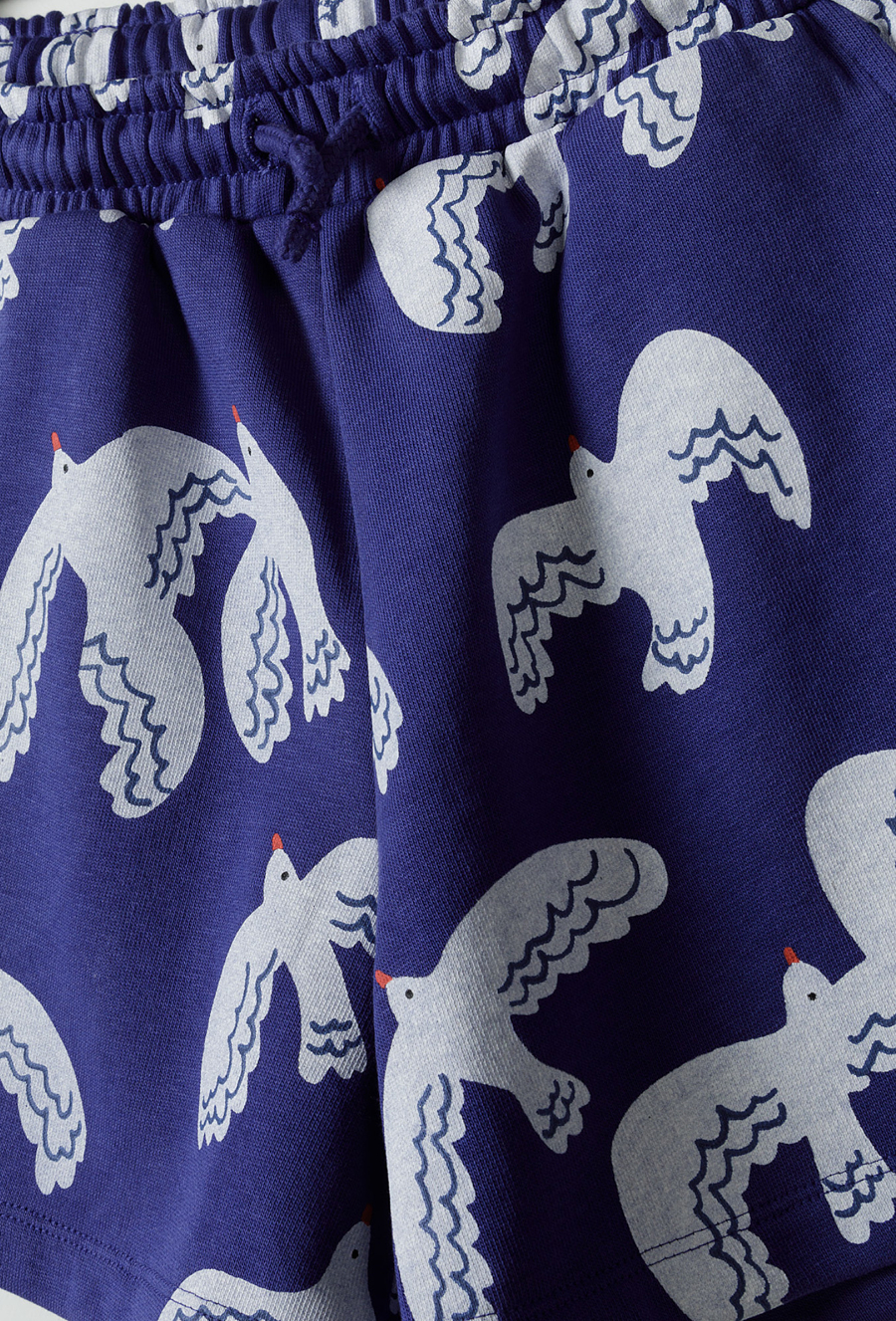 Poczuj powiew morskiej bryzy w codziennej szafie Twojego dziecka! Te granatowe szorty to idealne połączenie klasycznego stylu marynarskiego z niezastąpioną wygodą. Dzięki radosnemu nadrukowi spodenki doskonale wpisują się w wakacyjny klimat, będąc jednocześnie praktycznym wyborem na każdy dzień. Ciemnogranatowe tło spodenek ożywiają duże grafiki białych mew z czerwonymi dziobami. Wzór znajduje się na całej powierzchni szortów, co nadaje im dynamicznego i wesołego charakteru. Te granatowe spodenki dresowe to doskonała baza do wakacyjnych stylizacji – świetnie wyglądają w zestawieniu z białą koszulką polo, klasycznym T-shirtem lub sportowymi sandałkami.