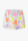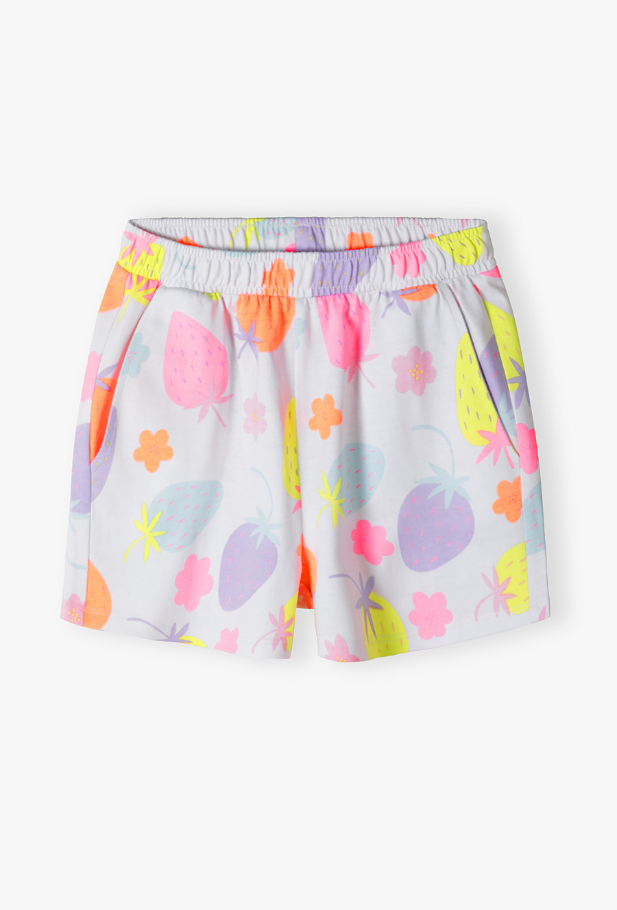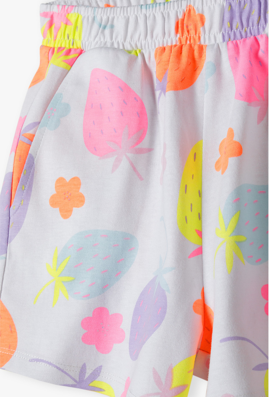 Szorty w kolorowe truskawki – owocowa energia i dresowa wygoda na lato. Przygotuj swoją córeczkę na wakacyjne przygody! Te białe szorty to połączenie maksymalnej swobody z niezwykle radosnym, letnim designem. Dzięki soczystym kolorom i miękkiemu materiałowi, spodenki te staną się ulubionym elementem stroju na plażę, plac zabaw czy rower. Białe tło spodenek zostało pokryte dużymi grafikami truskawek w neonowych odcieniach różu, pomarańczu, błękitu i fioletu. Ten nietypowy, kolorowy miks nadaje szortom nowoczesnego i bardzo wesołego charakteru. Nogawki o optymalnej długości zapewniają pełną swobodę ruchów i odpowiednią wentylację w upalne dni. Wzór pokrywa spodenki z obu stron, co sprawia, że prezentują się świetnie pod każdym kątem.