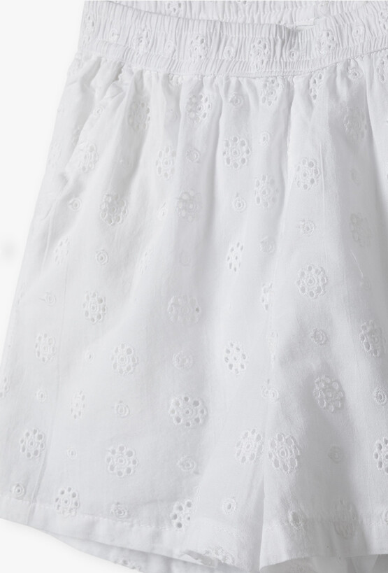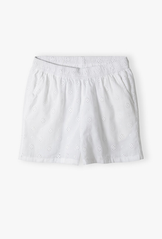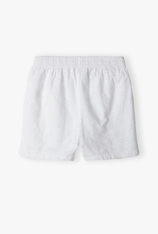 Dodaj odrobinę klasycznego szyku do letniej garderoby swojej córeczki! Te białe szorty to połączenie romantycznego stylu z najwyższym komfortem. Są idealnym wyborem na upalne dni, rodzinne uroczystości czy wakacyjne spacery. Śnieżnobiały kolor i ażurowe zdobienia sprawiają, że szorty pasują do wszystkiego – od kolorowych T-shirtów po eleganckie bluzki z bufkami. Szeroka, gęsto marszczona guma w pasie sprawia, że spodenki idealnie dopasowują się do sylwetki, nie uciskają brzuszka i są bardzo łatwe do samodzielnego zakładania przez dziecko. Model posiada dwie dyskretne, wpuszczane kieszenie boczne, w których każda mała dama może ukryć swoje skarby.