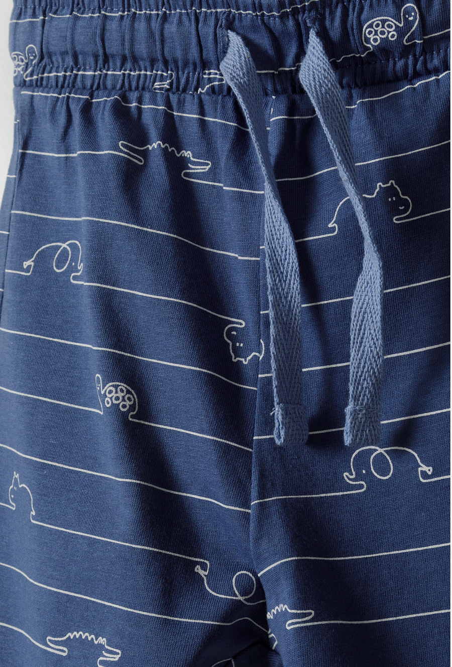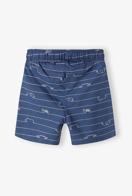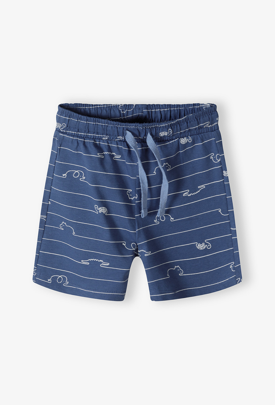 Szorty niemowlęce – komfort i radosny design dla malucha. Zapewnij swojemu dziecku pełną swobodę ruchów i uroczy wygląd w słoneczne dni! Te niebieskie szorty o długości 1/3 to idealne połączenie miękkości dzianiny z unikalnym wzornictwem, które zaciekawi każdego małego odkrywcę. Cała powierzchnia szortów pokryta jest białą grafiką typu „line art”. Cienkie, poziome linie tworzą kontury zabawnych zwierząt – krokodyli, żółwi, słoni i hipopotamów, co nadaje ubraniu nowoczesnego i lekkiego charakteru. Krótkie nogawki o długości 1/3 są idealne na upały, zapewniając maluchowi przewiewność i komfort termiczny. Te szorty to doskonała baza letniej garderoby niemowlęcej – są praktyczne, trwałe i pełne pozytywnej energii.