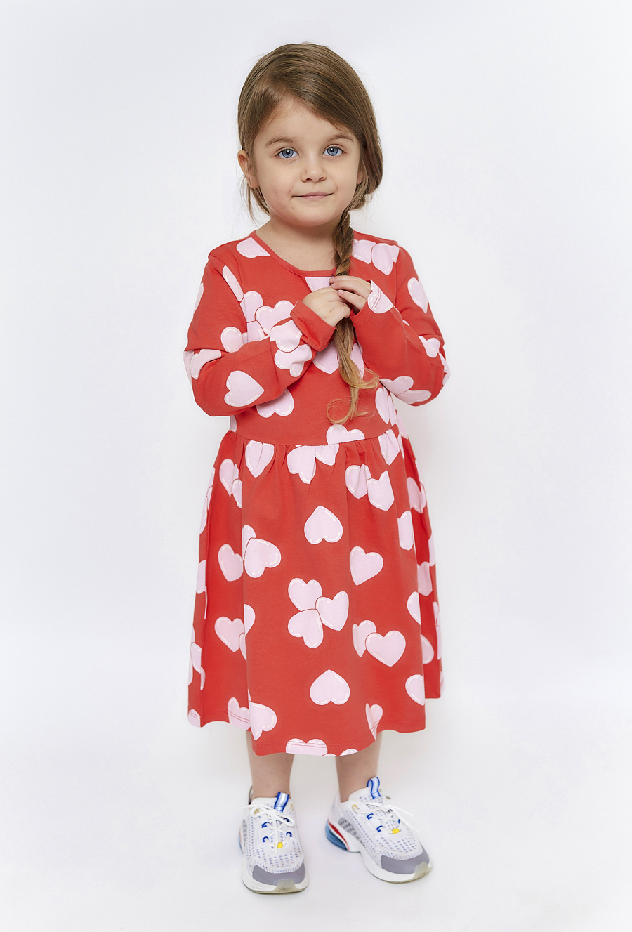 Dziewczęca sukienka z długim rękawem w intensywnym czerwonym kolorze, ozdobiona nadrukiem serc. Miękki materiał zapewnia komfort noszenia przez cały dzień, a rozkloszowany dół dodaje lekkości. Klasyczny okrągły dekolt i luźny fason sprawiają, że sukienka świetnie sprawdzi się zarówno na co dzień, jak i podczas wyjątkowych okazji. Idealna do noszenia solo lub w zestawieniu z legginsami w chłodniejsze dni.