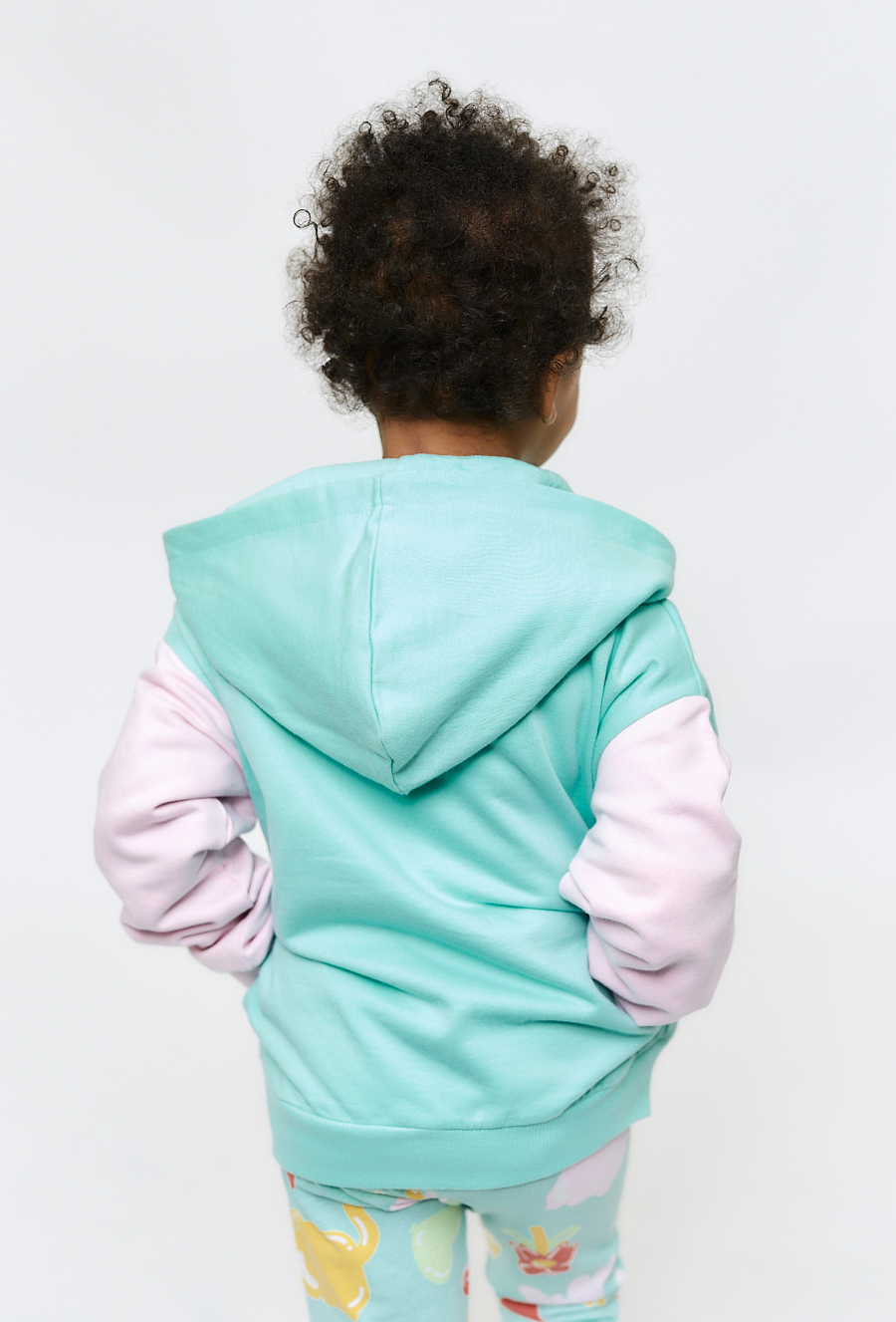 Kolorowa bluza z kapturem to propozycja dla dziewczynki, która lubi połączenie wygody i uroczego designu. Miętowy przód kontrastuje z różowymi rękawami, a kieszonkę zdobi nadruk słodkiego kotka. Bluza zapinana na suwak, wykonana z miękkiego materiału, zapewnia komfort noszenia przez cały dzień. Doskonała na chłodniejsze dni i codzienne aktywności.