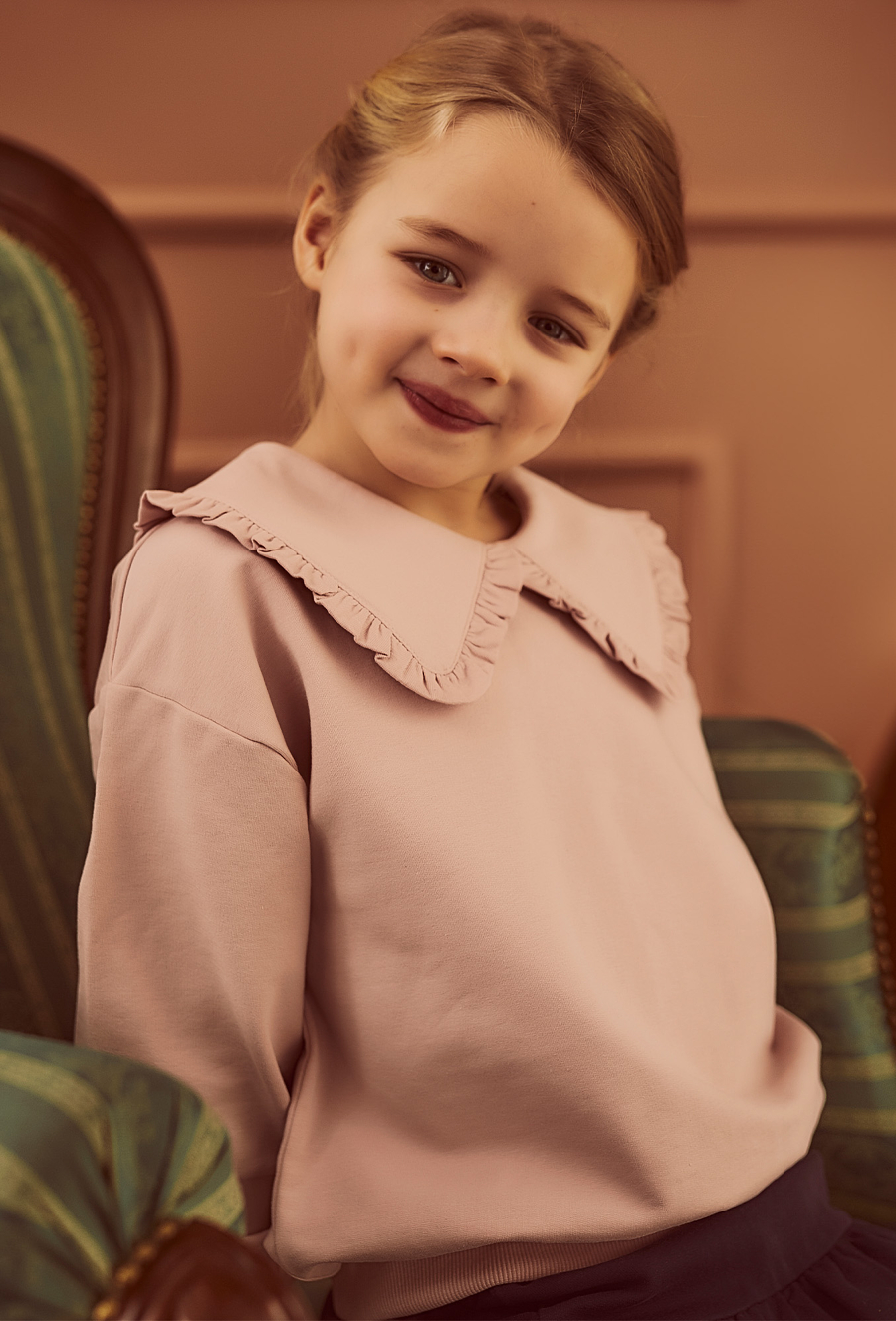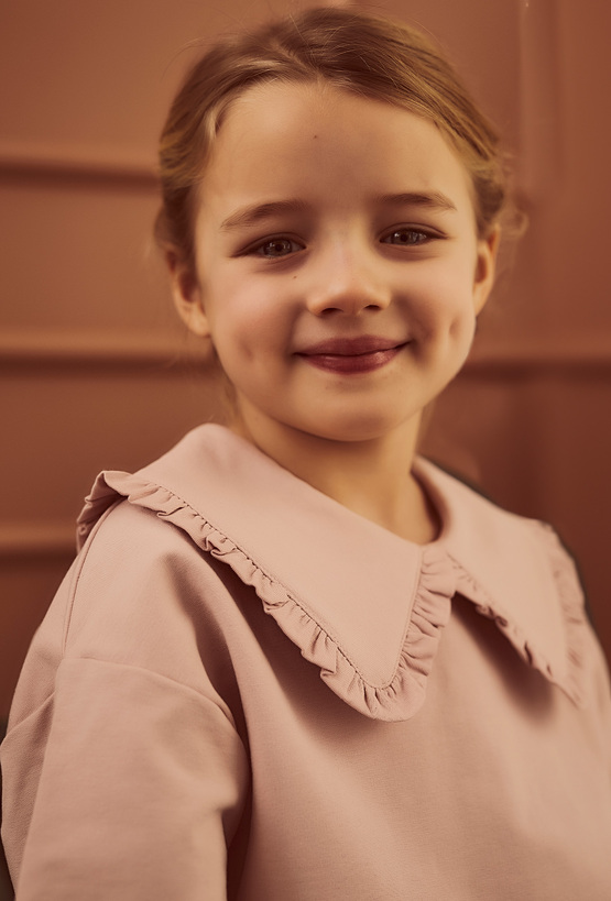 Bluza dla dziewczynki łącząca wygodę i dziewczęcy urok. Wykonana z miękkiej, przyjemnej w dotyku dzianiny w odcieniu pudrowego różu, zapewnia komfort noszenia przez cały dzień. Ozdobny kołnierz wykończony subtelną falbanką nadaje jej eleganckiego charakteru, dzięki czemu sprawdzi się zarówno w codziennych stylizacjach, jak i podczas rodzinnych uroczystości. Doskonała do spódniczek, legginsów i spodni – must-have w szafie każdej małej damy.