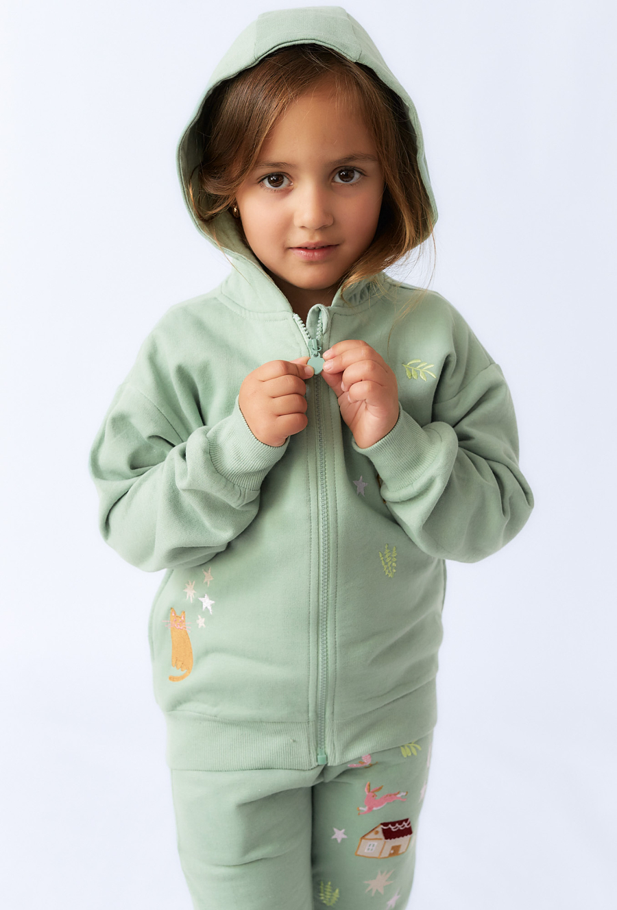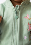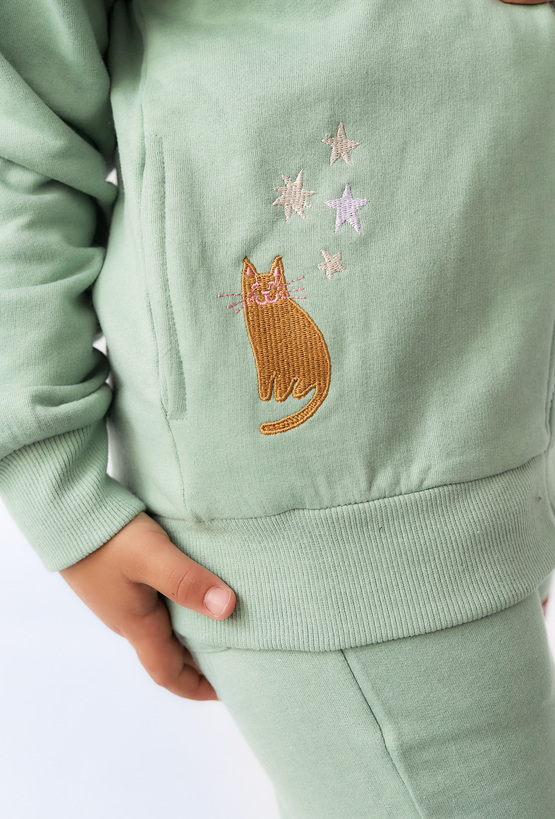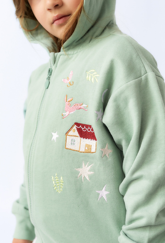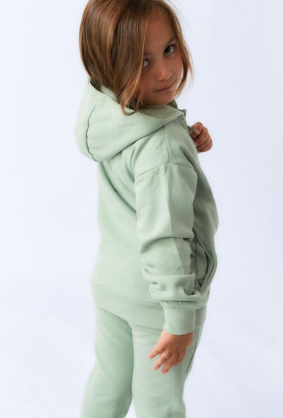 Miętowa bluza dziewczęca z kapturem to połączenie wygody i uroczego stylu. Wykonana z miękkiej, przyjemnej w dotyku dzianiny bawełnianej, zapewnia komfort noszenia przez cały dzień. Bluza ma praktyczne zapięcie na suwak i elastyczne ściągacze przy rękawach i u dołu. Delikatne nadruki z motywami natury i zwierząt dodają jej uroku i dziewczęcego charakteru. Idealna na przedszkole, spacer czy zabawę – wygodna, miękka i urocza bluza na każdy dzień!