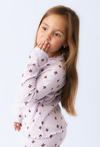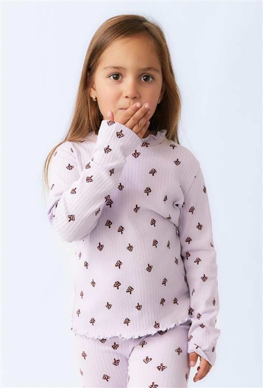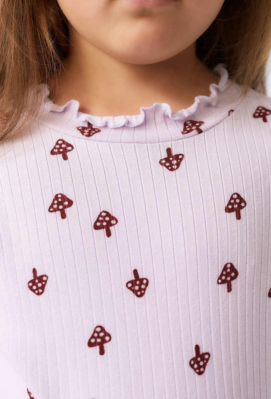 Dziewczęca bluzka z długim rękawem uszyta z miękkiej dzianiny, która dzięki dodatkowi elastanu idealnie dopasowuje się do sylwetki i zapewnia wygodę noszenia przez cały dzień. Delikatny, pastelowy odcień ozdobiono drobnym nadrukiem w grzybki, które dodają całości dziewczęcego uroku. Model wykończony jest subtelnymi falbankami przy brzegach, co sprawia, że bluzka prezentuje się lekko i dziewczęco. To świetny wybór zarówno na co dzień, jak i do bardziej casualowych stylizacji.