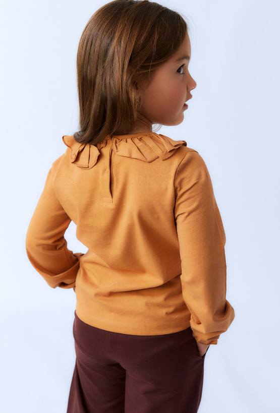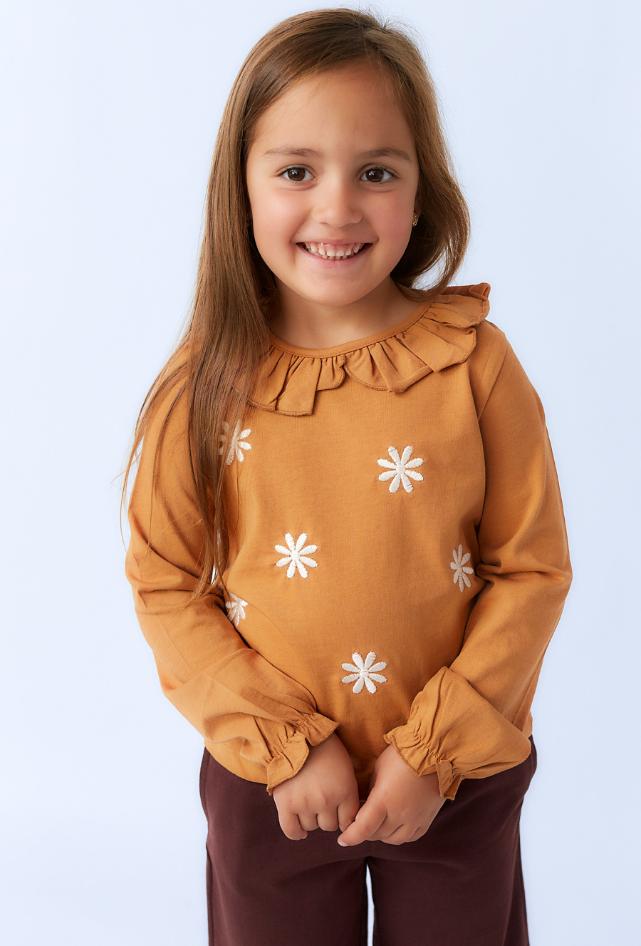 Bluzka z długim rękawem dla dziewczynki łącząca wygodę i dziewczęcy urok. Uszyta w całości z naturalnej bawełny, jest przyjemna w dotyku i zapewnia komfort przez cały dzień. Ozdobiona uroczymi haftowanymi kwiatami, zyskuje subtelny i radosny charakter. Model wyróżnia się falbanką przy dekolcie oraz delikatnie marszczonymi mankietami, które dodają całości lekkości i elegancji. Doskonała propozycja zarówno do codziennych stylizacji, jak i na specjalne okazje, gdzie liczy się styl i swoboda.