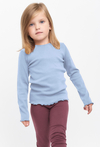 Bluzka z długim rękawem dla dziewczynki wykonana z miękkiej, przyjemnej w dotyku bawełny. Doskonale sprawdzi się zarówno na co dzień jako baza stylizacji. Delikatnie falowane wykończenia przy rękawach i u dołu bluzki dodają dziewczęcego charakteru. Materiał jest elastyczny i dobrze dopasowuje się do sylwetki. Bluzka świetnie wygląda samodzielnie lub jako warstwa pod sweterek czy bluzę.