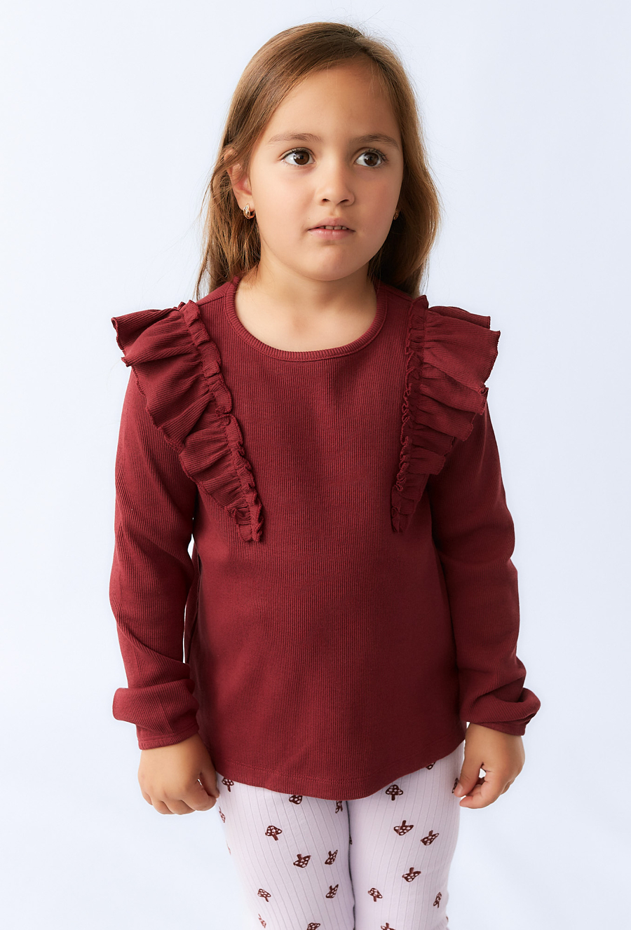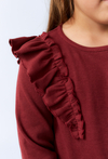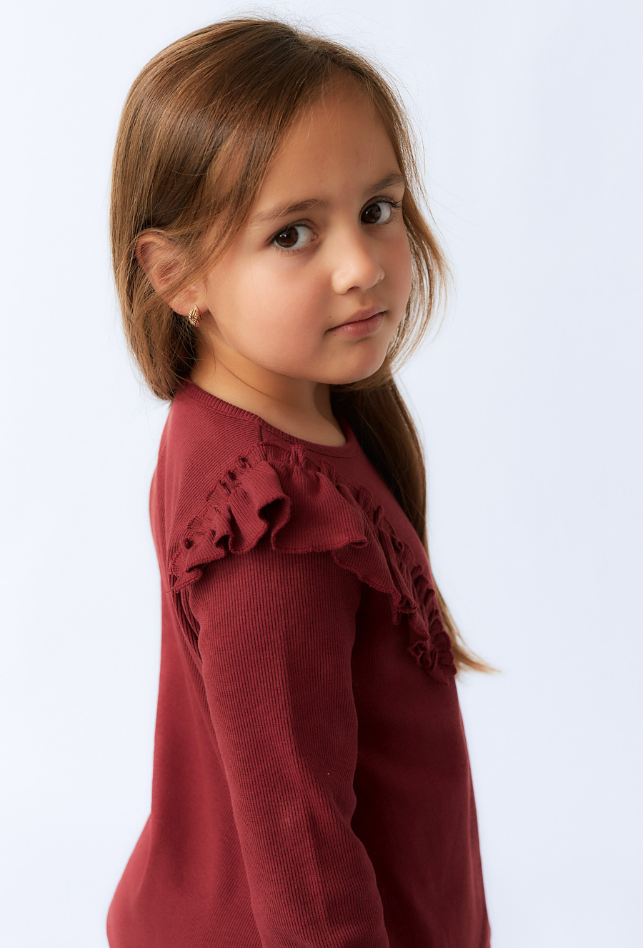 Elegancka bluzka z długim rękawem dla dziewczynki w pięknym bordowym kolorze to idealny wybór na co dzień i specjalne okazje. Modne falbanki z przodu dodają uroku, a miękka, elastyczna i przyjemna w dotyku dzianina gwarantuje komfort. Świetnie komponuje się zarówno ze spódniczką, jak i z legginsami czy eleganckimi spodniami. Doskonała do przedszkola, szkoły czy na rodzinne, świąteczne spotkania.