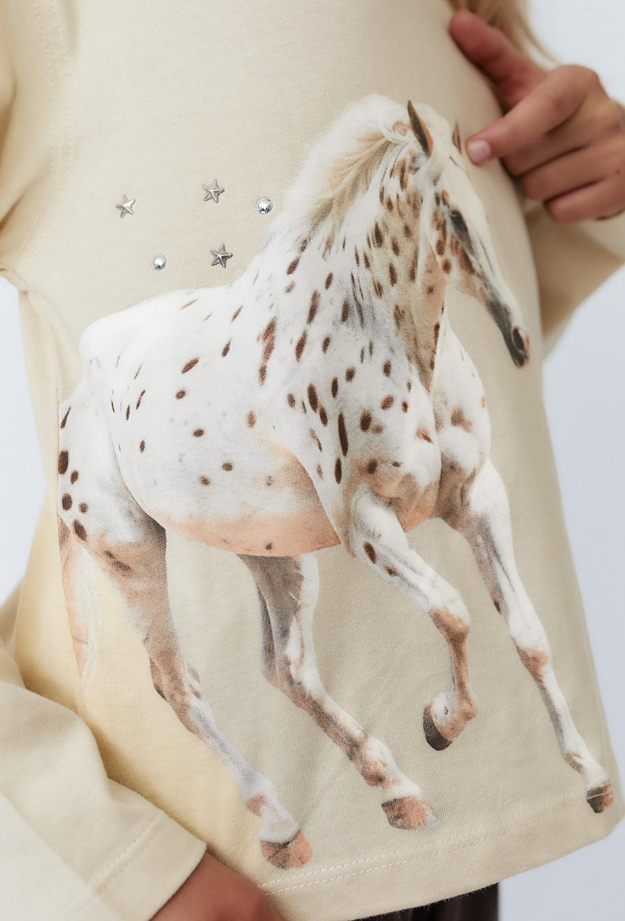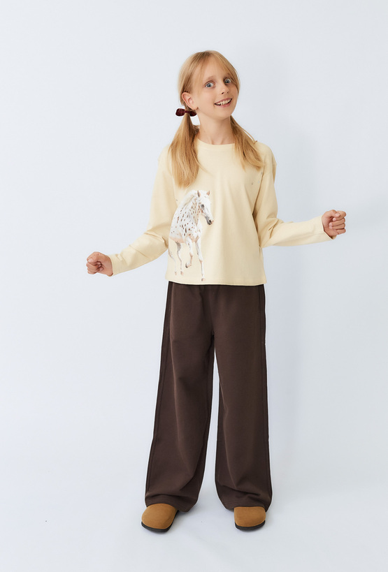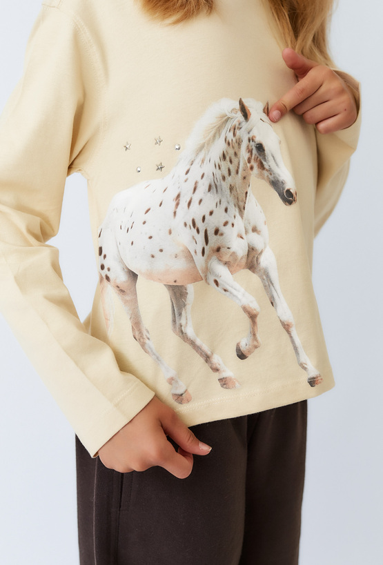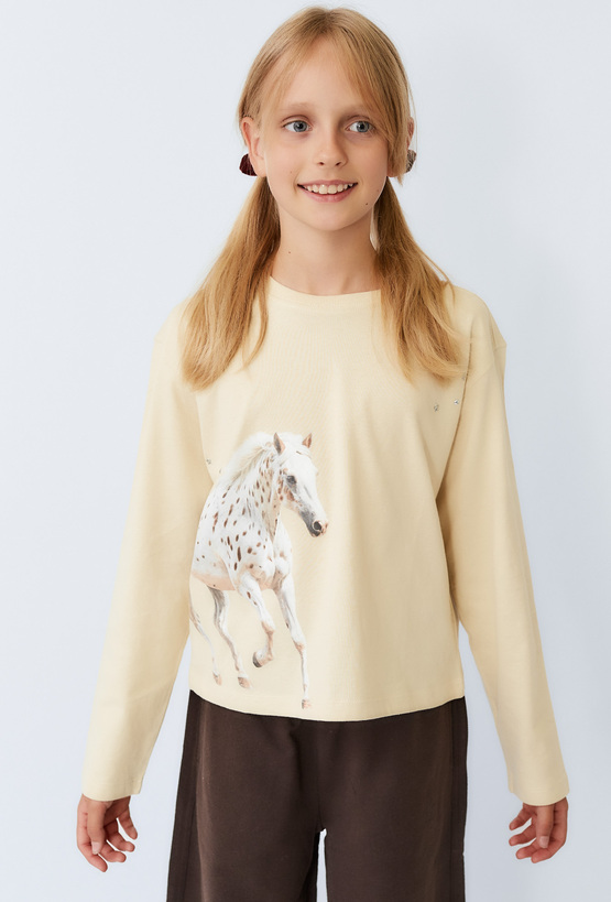 Ta bluzka to propozycja dla dziewczynek, które uwielbiają modę z motywami zwierzęcymi. Wykonana w 100% z miękkiej bawełny, jest przewiewna, przyjemna w dotyku i komfortowa w noszeniu każdego dnia. Beżowy kolor w połączeniu z realistycznym nadrukiem galopującego konia nadaje jej wyjątkowego charakteru. Klasyczny fason z długim rękawem i okrągłym dekoltem sprawia, że bluzka jest uniwersalna i pasuje do wielu stylizacji. Świetnie sprawdzi się zarówno w szkole, jak i podczas codziennych aktywności. Można ją łatwo zestawić z jeansami, legginsami lub spódnicą, tworząc modne i wygodne zestawy.