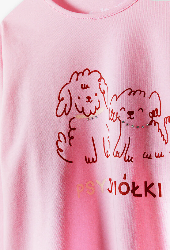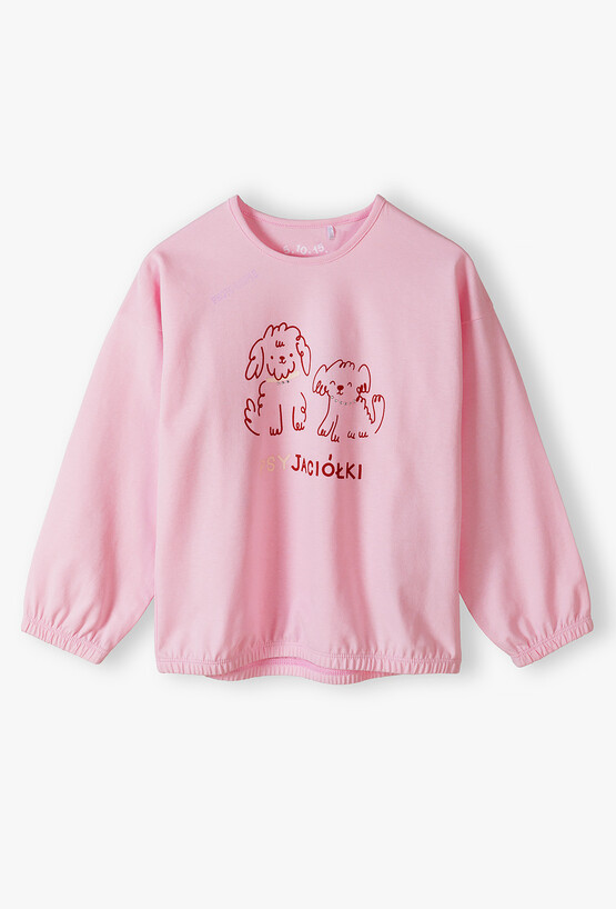 Różowa bluzka z długim rękawem to idealny wybór dla małych miłośniczek zwierzaków! Model zdobi uroczy nadruk dwóch piesków oraz zabawny napis „Psyjaciółki”, który dodaje całości przyjaznego charakteru. Bluzka została wykonana z miękkiej, przyjemnej w dotyku dzianiny. Luźniejszy krój i elastyczne wykończenia przy mankietach oraz u dołu gwarantują swobodę ruchów i świetne dopasowanie. To doskonała propozycja na co dzień – do szkoły, przedszkola, do zabaw i spacerów. Świetnie komponuje się zarówno z jeansami, jak i legginsami, tworząc lekkie i dziewczęce stylizacje. Idealna dla małych „psi-jaciółek”!