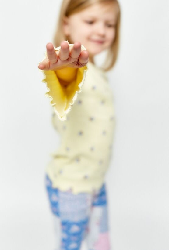 Jasnożółta bluzka z długim rękawem ozdobiona drobnymi kwiatuszkami i czarnymi kropeczkami to lekka i wygodna propozycja dla dziewczynki. Delikatne falbanki na zakończeniach rękawów i przy dolnym brzegu dodają jej subtelnego wykończenia. Bluzka wykonana z przyjemnej w dotyku dzianiny dobrze dopasowuje się do sylwetki i sprawdzi się zarówno na co dzień, jak i pod sweter czy bluzę.