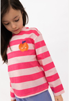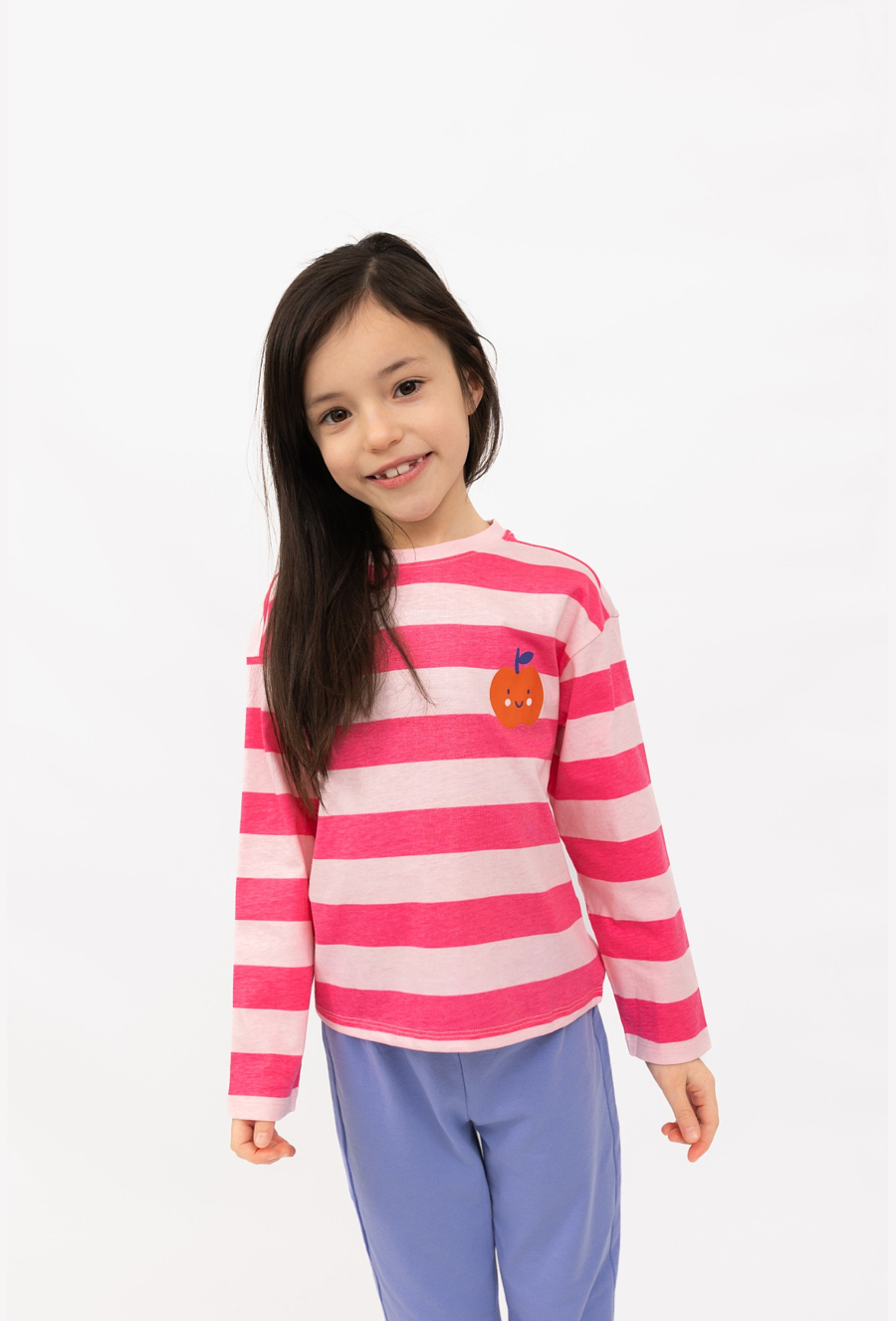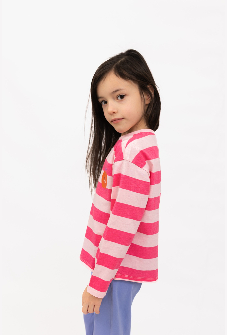 Różowa bluzka dziewczęca z długim rękawem w klasyczne paski to świetna baza do codziennych stylizacji. Wykonana z 100% bawełny, jest miękka, oddychająca i przyjemna dla skóry. Uroczy miękki nadruk z przodu dodaje całości dziecięcego charakteru, a wygodny krój sprawdzi się w szkole, przedszkolu i podczas zabawy.
