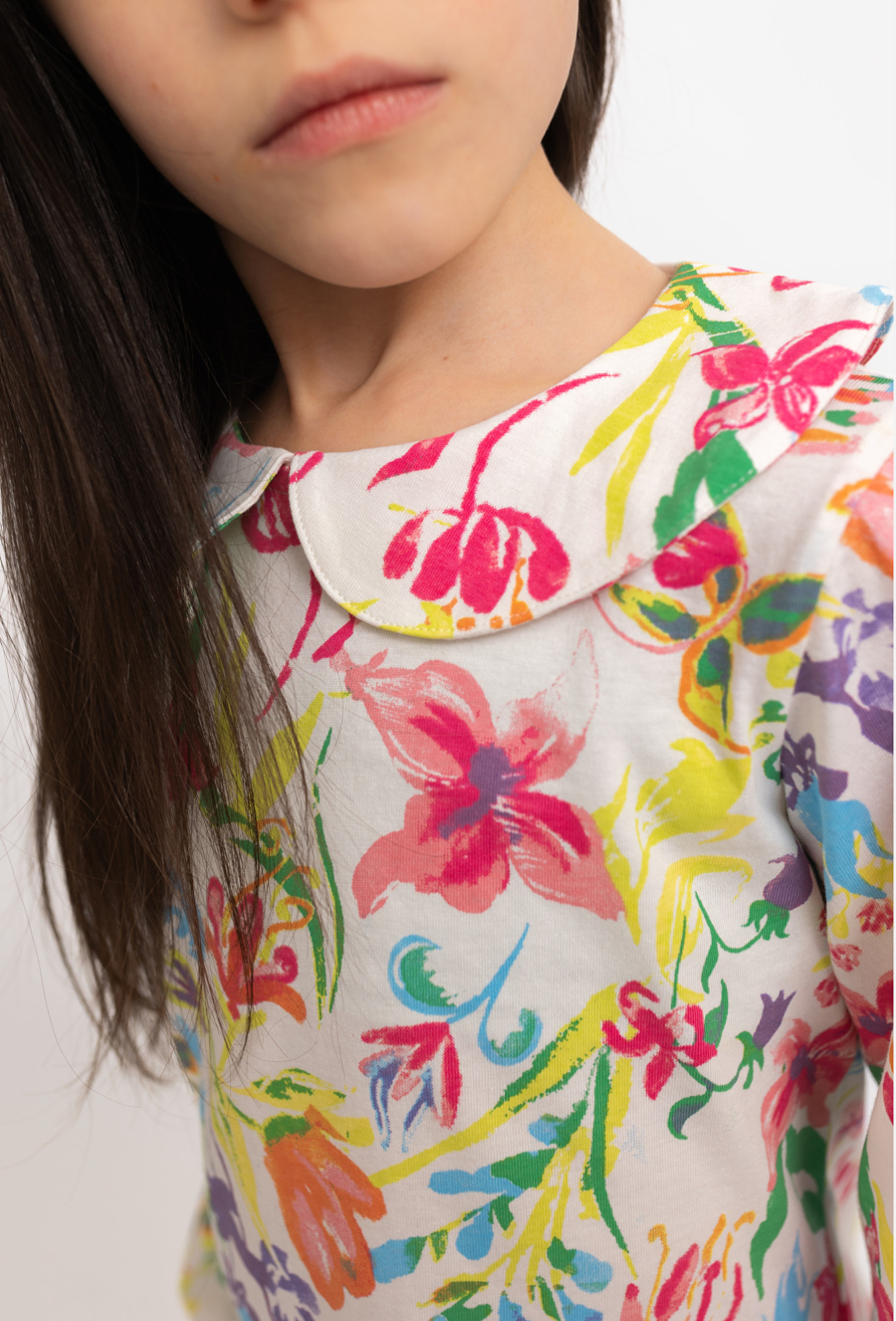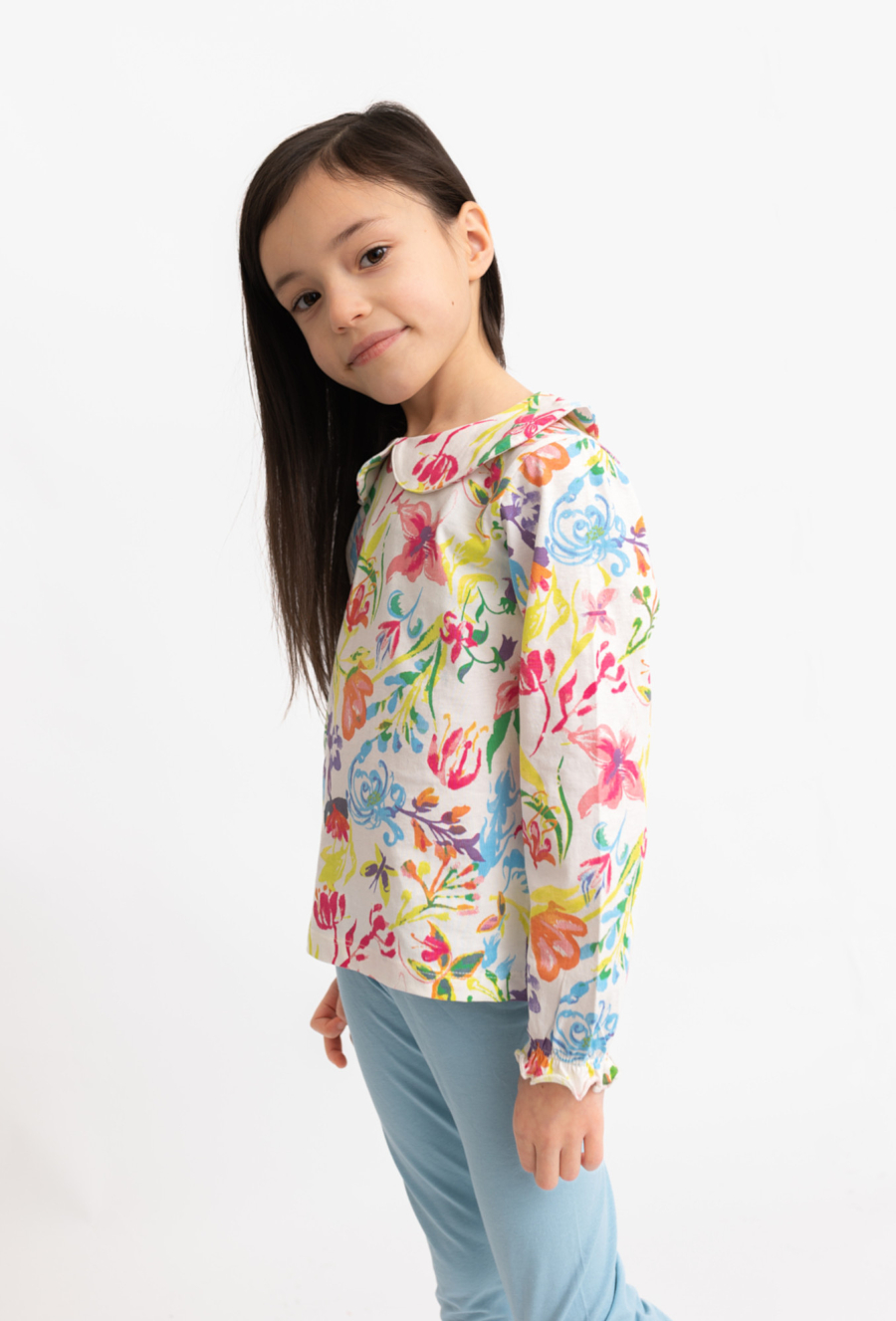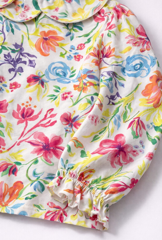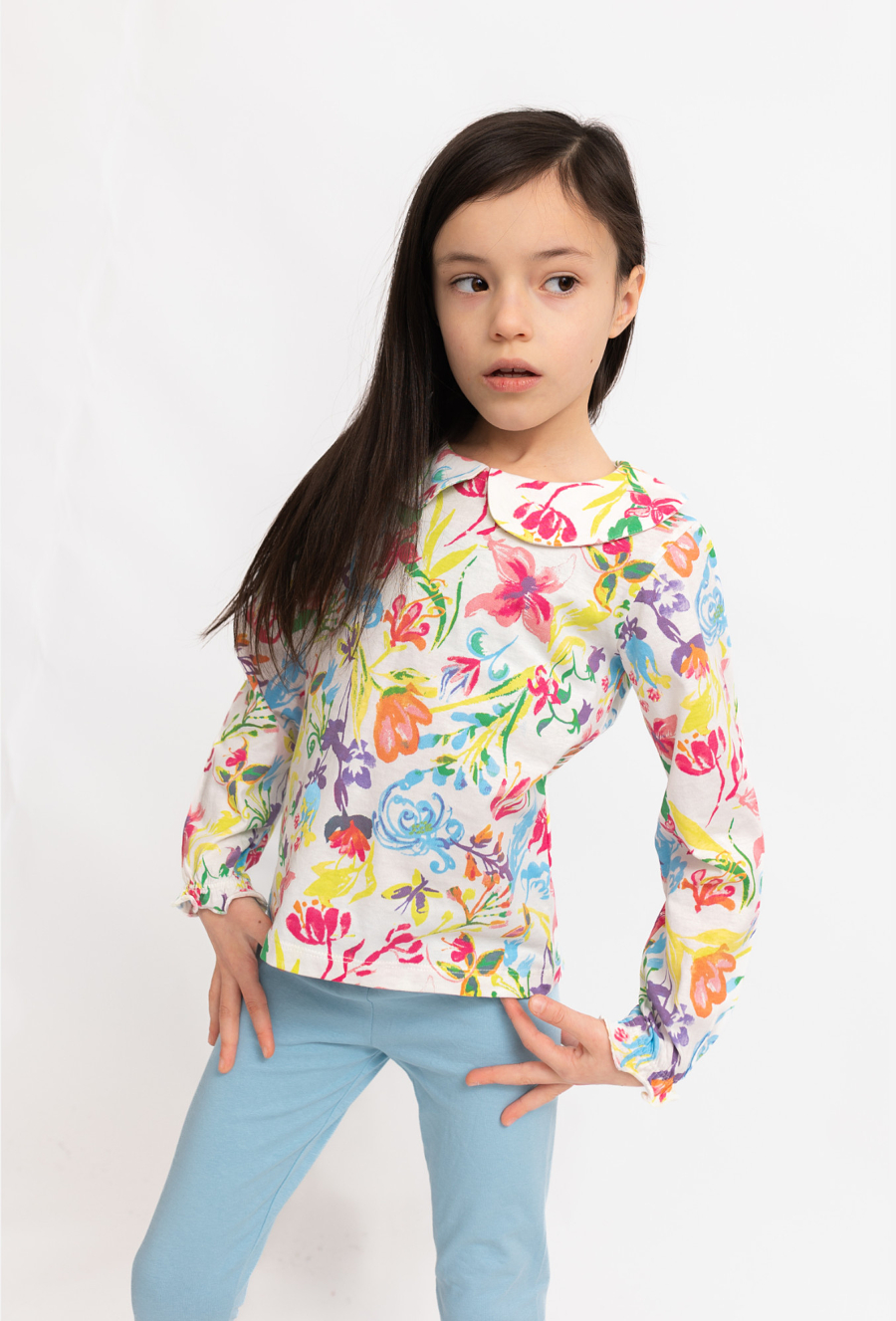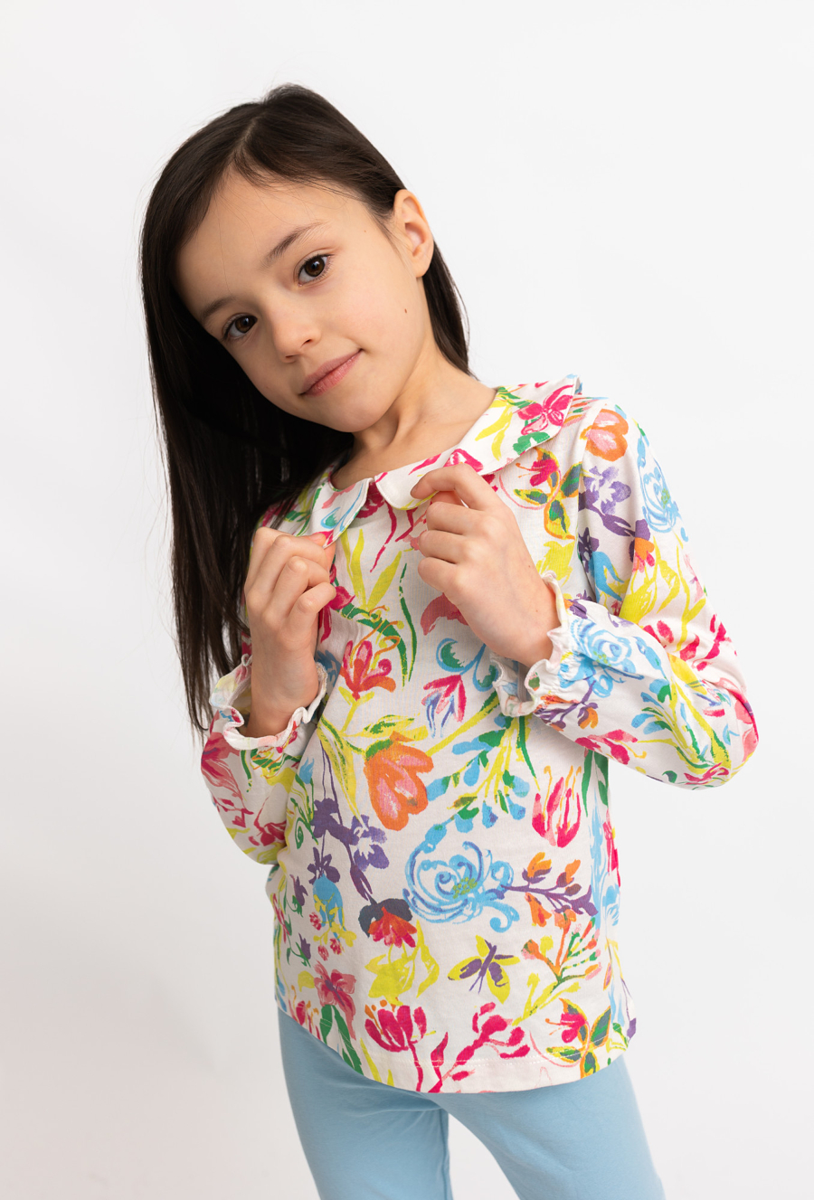 Stylowa i wygodna propozycja dla małej elegantki. Ta beżowa bluzka 51015 z długim rękawem została wykonana w 100% z bawełny, co zapewnia pełen komfort noszenia. Całość zdobi kolorowy, kwiatowy nadruk oraz delikatny kołnierzyk, który nadaje jej dziewczęcego charakteru. Praktyczne gumeczki w rękawach oraz zapięcie na napy z tyłu to rozwiązania, które znacząco ułatwiają codzienne ubieranie.