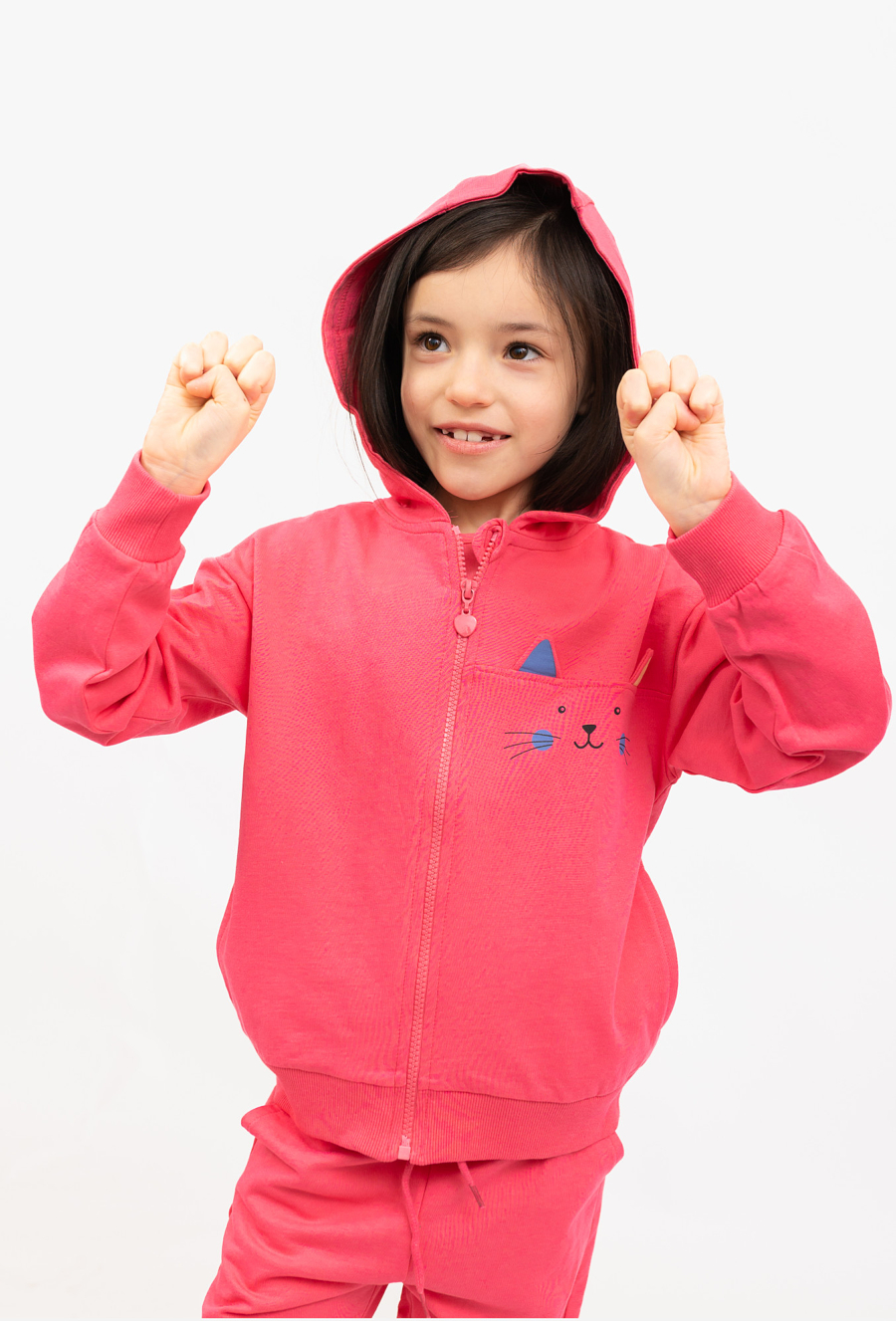 Różowa bluza dziewczęca rozpinana z kapturem to połączenie wygody i uroczego detalu. Wykonana z 100% bawełny, jest miękka i przyjemna dla skóry – idealna na co dzień, do szkoły, przedszkola i na spacer. Bluza ma praktyczne kieszenie ukryte w bocznych szwach, a uwagę przyciąga słodka aplikacja uszów kotka (z nadrukowanym pyszczkiem) na przodzie. Zamek ułatwia zakładanie i dopasowanie do temperatury.