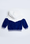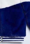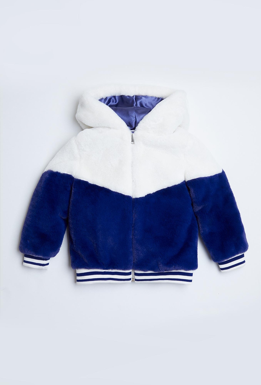 Otul swoją córeczkę niesamowitą miękkością! Ta biało-niebieska bluza wykonana z gęstego, puszystego futerka to idealne połączenie przytulności domowego kocyka z modnym fasonem typu bomber. Świetnie sprawdzi się jako ciepła warstwa w chłodniejsze dni, zastępując lekką kurtkę. Połączenie kolorów białego i nasyconego niebieskiego w formie geometrycznego odcięcia w kształcie litery V nadaje bluzie nowoczesnego i dynamicznego wyglądu. Wzór ten kontynuowany jest również na plecach. Obszerny, futrzany kaptur z satynową podszewką skutecznie chroni główkę i uszy przed wiatrem.