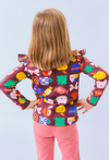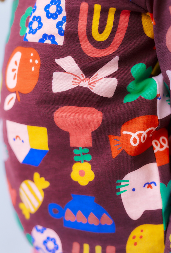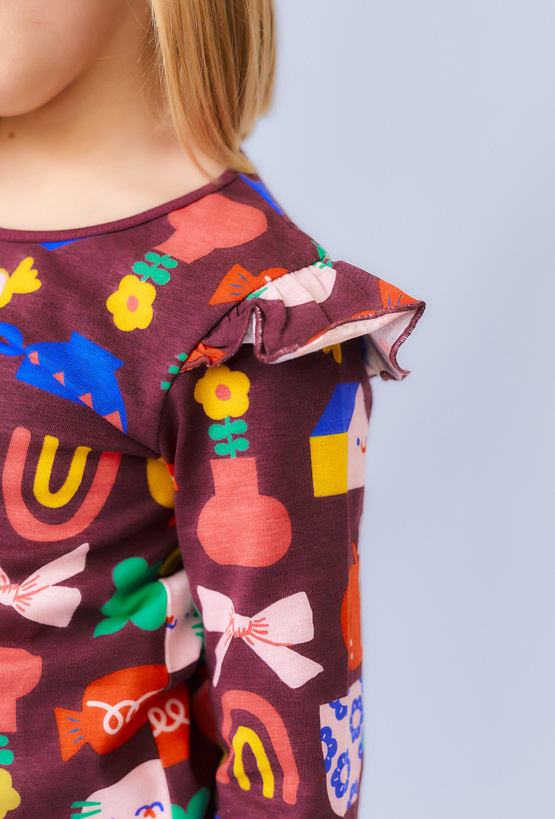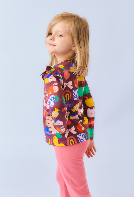 Ta bluzka to prawdziwa eksplozja kolorów i dziecięcej radości! Na brązowym tle rozgościły się urocze nadruki – od kotków i jabłek po cukierki i kokardki – które zachwycą każdą dziewczynkę i dodadzą energii każdej stylizacji. Falbanki na ramionach dodają lekkości i dziewczęcego wdzięku, a miękka, 100% bawełna zapewnia maksymalny komfort nawet przy najbardziej aktywnym dniu. Idealna do przedszkola, na spacer i każdą małą i wielką przygodę!