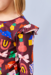 Brązowa dziewczęca sukienka z falbankami i nadrukiem cukierków