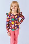 Brązowa bluzka dziewczęca z falbankami i kolorowym printem