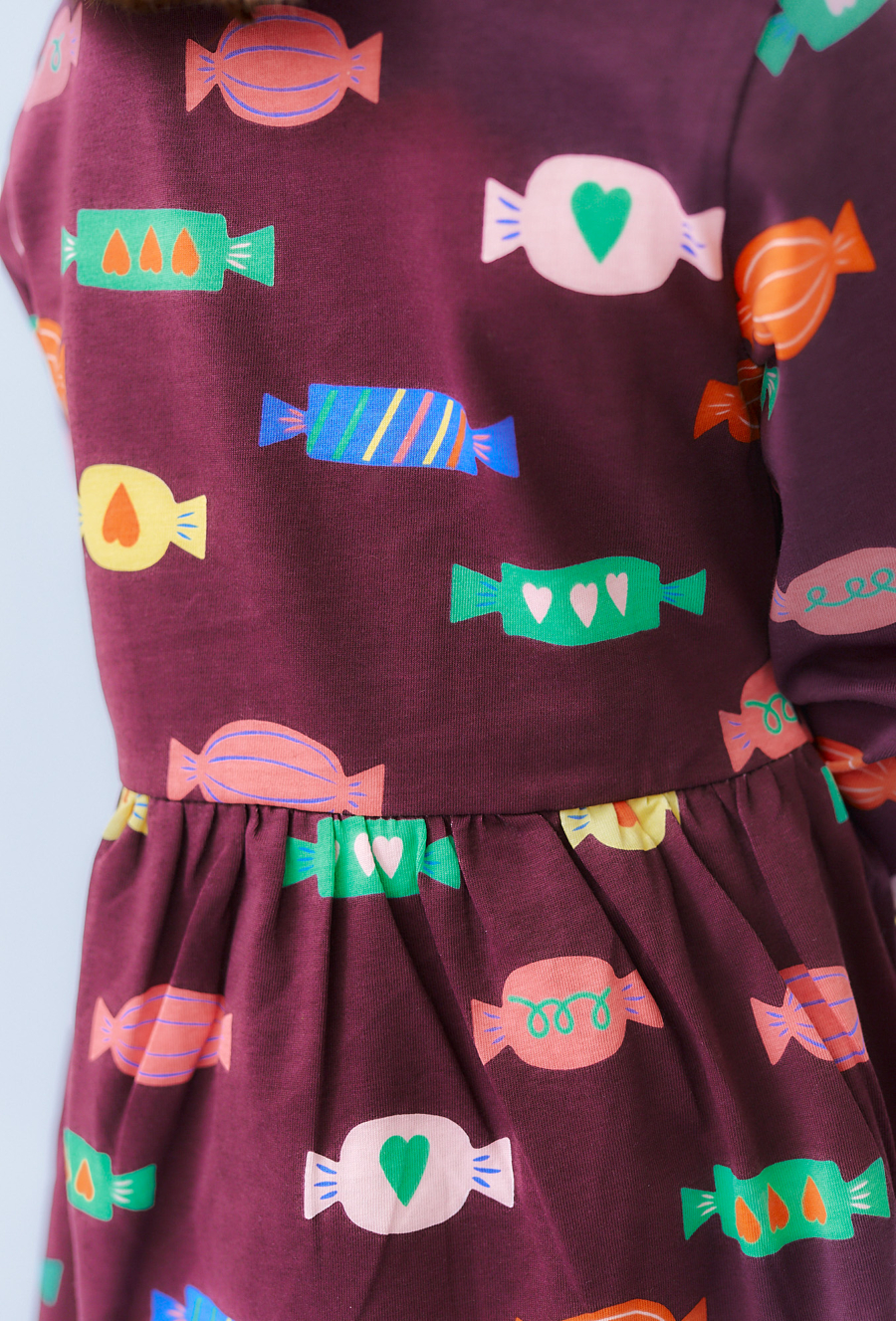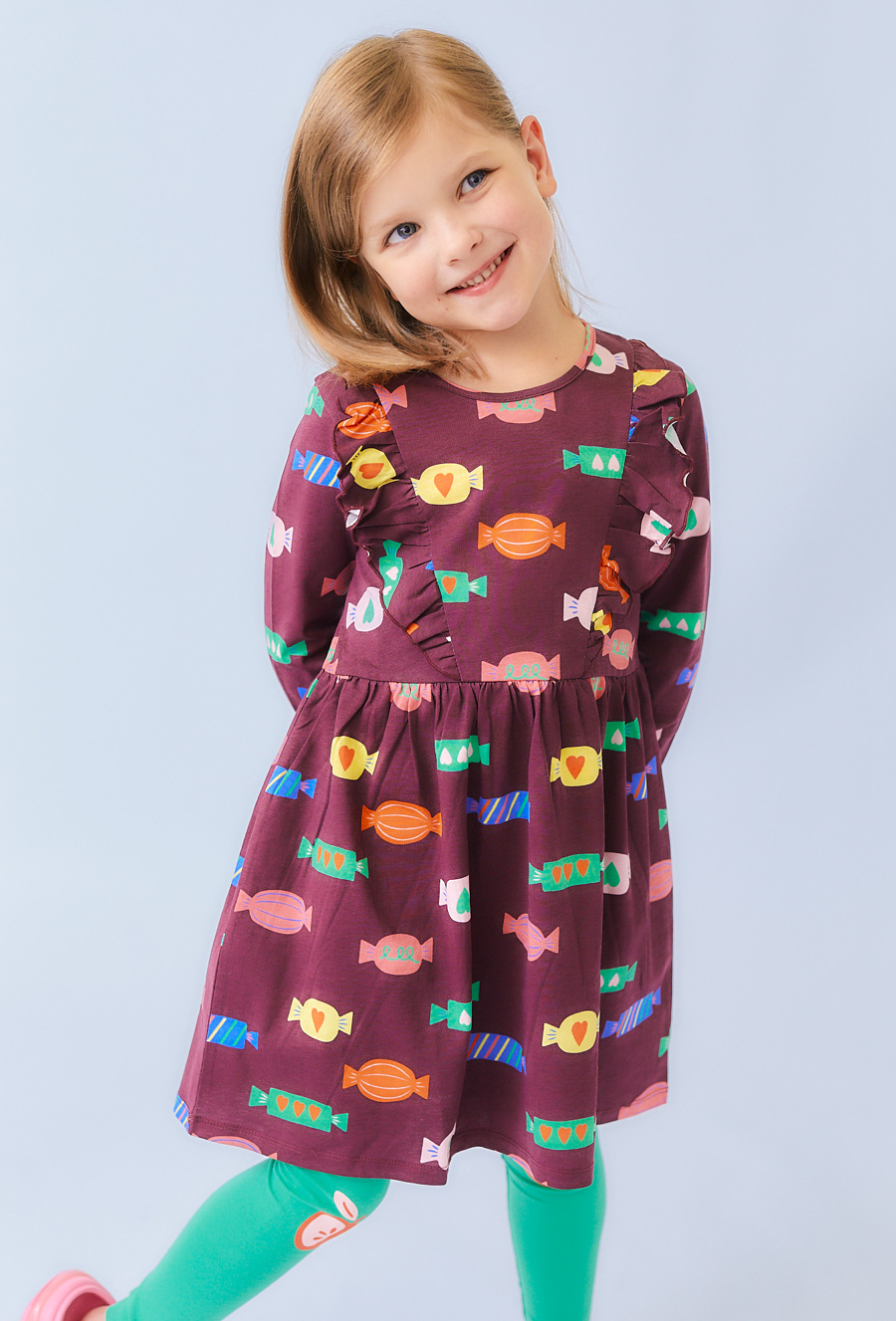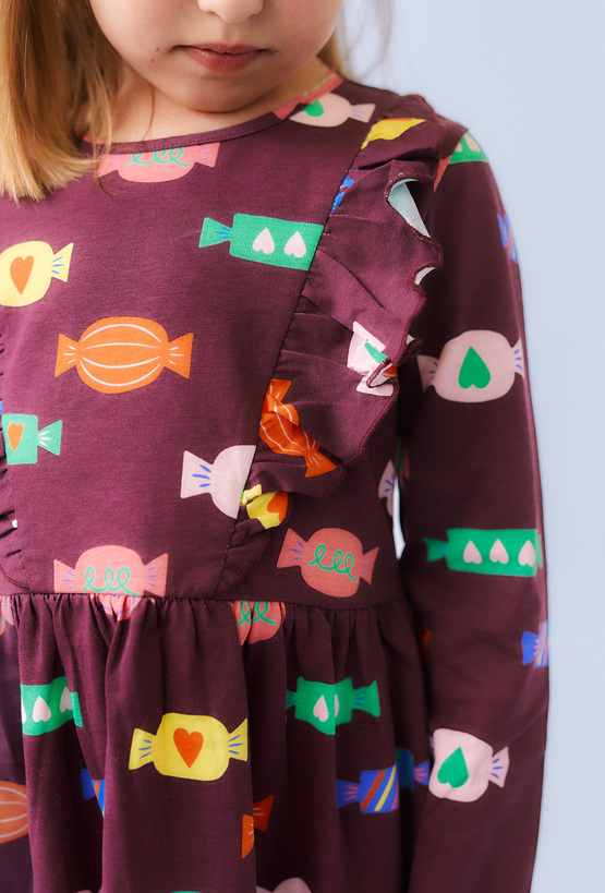 Brązowa dziewczęca sukienka z falbankami i nadrukiem cukierków