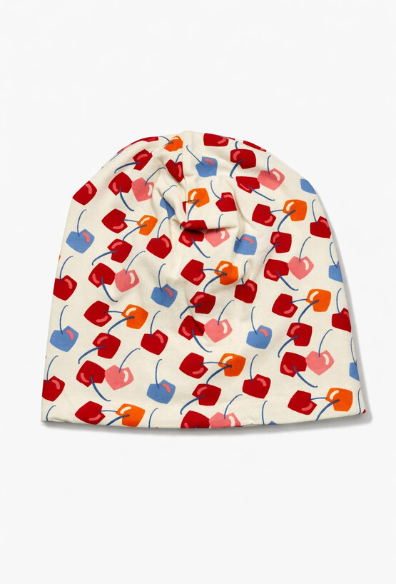 Cienka czapka dla dziewczynki w kolorowy print wisienek na tle ecru. Uszyta z miękkiej dzianiny, jest lekka, elastyczna i komfortowa w noszeniu. Świetnie sprawdzi się w sezonie przejściowym – na wiosnę, jesień oraz chłodniejsze poranki. Prosty fason pasuje do codziennych stylizacji i łatwo dopasowuje się do głowy.
