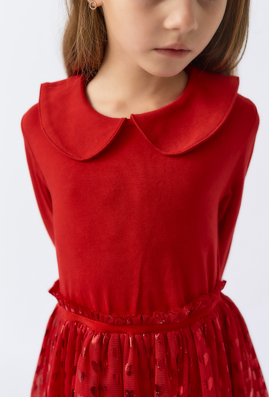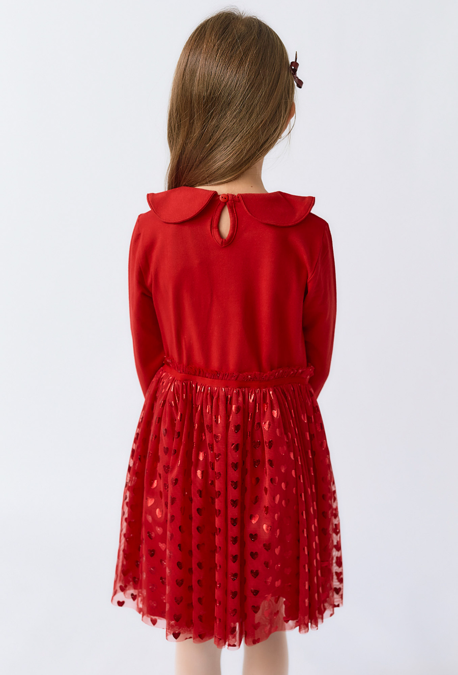 Stylowa i wygodna sukienka dziewczęca z długim rękawem, idealna na świąteczne przyjęcia, urodziny czy ważne uroczystości. Góra wykonana z miękkiej dzianiny bawełnianej z domieszką elastanu zapewnia komfort i swobodę ruchu. Uroku dodaje delikatny, zaokrąglony kołnierzyk typu Peter Pan. Rozkloszowany dół z tiulu ozdobiony jest błyszczącymi serduszkami, które pięknie mienią się w świetle, dodając dziewczęcego wdzięku każdemu ruchowi. W talii elastyczna gumka zapewniająca dobre dopasowanie.