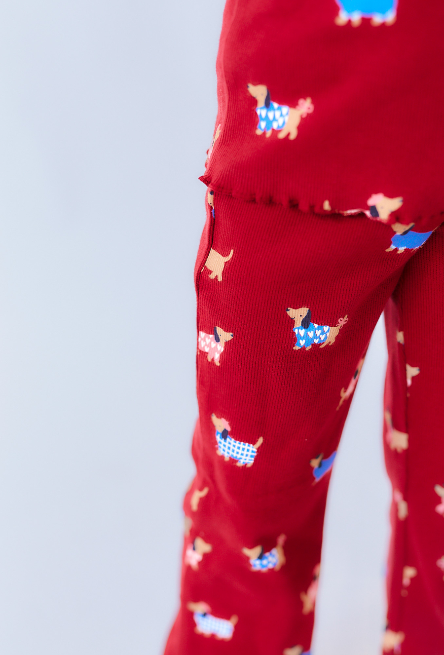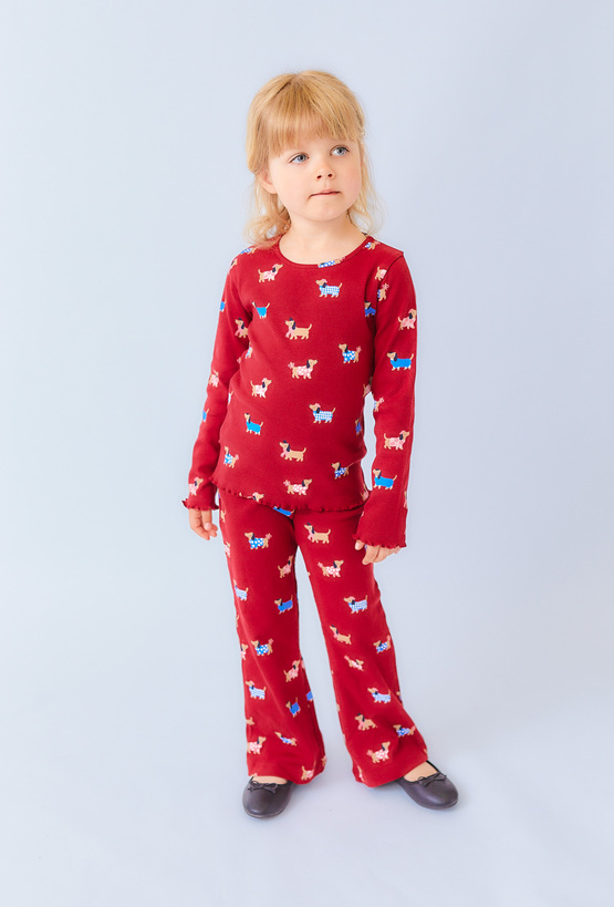 Czerwone spodnie dziewczęce wykonane z prążkowanej dzianiny (95% bawełna, 5% elastan) ozdobione uroczym wzorem w kolorowe pieski. Elastyczny materiał zapewnia wygodę noszenia, a oryginalny nadruk dodaje całości dziecięcego uroku. Idealne na codzienne stylizacje i zabawę.