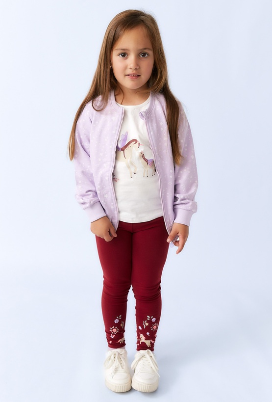 Dziewczęce legginsy z bawełny – liliowe z nadrukiem