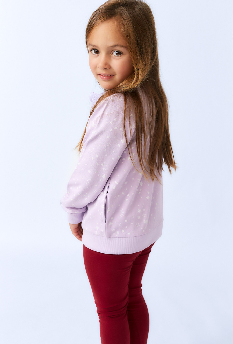 Wygodna i stylowa- liliowa bluza rozpinana na stójce to świetny wybór dla każdej dziewczynki. Wykonana z wysokogatunkowej bawełnianej dzianiny, jest miękka w dotyku, przyjazna dla skóry i zapewnia komfort przez cały dzień. Nadruk w białe gwiazdki oraz klasyczny krój z funkcjonalnym zamkiem sprawiają, że bluza pasuje zarówno do legginsów, jak i spódniczek czy jeansów. Stójka chroni szyję przed chłodem, dzięki czemu bluza sprawdzi się doskonale w przejściowe pory roku.