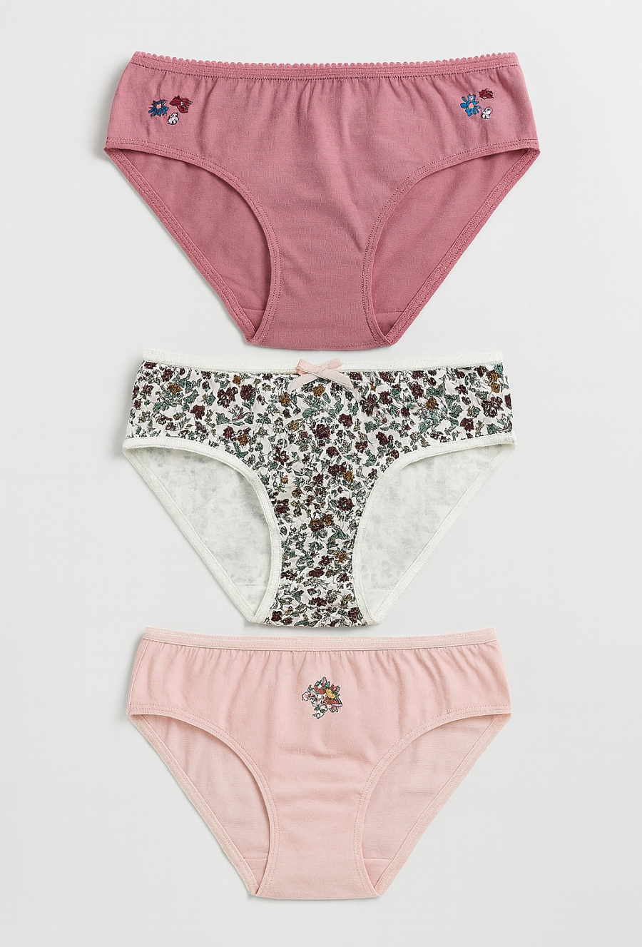 Zestaw trzech dziewczęcych majteczek, wykonane w 100% z miękkiej i oddychającej bawełny, są delikatne dla skóry i zapewniają komfort przez cały dzień. W komplecie znajdują się trzy różne wzory: gładkie różowe majteczki z haftowanymi kwiatuszkami, model z drobnym kwiatowym nadrukiem i kokardką, pastelowe w odcieniu pudrowego różu z subtelnym haftem. Doskonały wybór do codziennego noszenia – wygoda i uroczy styl w jednym.