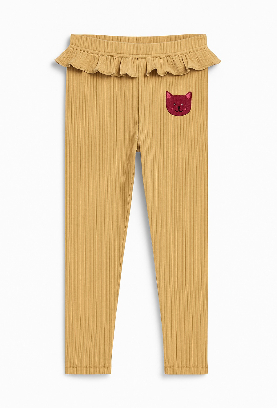 Dziewczęce prążkowane legginsy z falbanką i aplikacją kotka