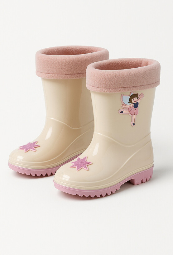 Kalosze dla dziewczynki stworzone z myślą o zabawie w każdych warunkach pogodowych! Wodoodporna cholewka chroni przed deszczem i kałużami, a miękka, wyjmowana wkładkę z polaru w formie skarpety, zapewnia komfort i ciepło. Delikatny kremowy kolor, różowe wykończenia oraz aplikacja wróżki i brokatowych gwiazdek dodają bajkowego uroku. Antypoślizgowa podeszwa zapewnia stabilność na mokrych nawierzchniach. Idealne do przedszkola, na spacery i zabawę na świeżym powietrzu – kalosze, które pokochają wszystkie małe fanki magicznych motywów.