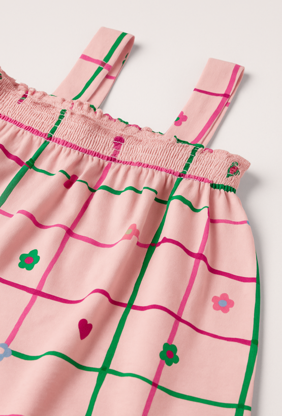 Ta koszulka dziewczęca na ramiączkach to idealny wybór na ciepłe dni. Wyróżnia się oryginalnym nadrukiem w kratkę z subtelnymi, kolorowymi kwiatkami, które dodają dziewczęcego uroku. Elastyczna, marszczona góra zapewnia wygodne dopasowanie i komfort noszenia, a szerokie ramiączka sprawiają, że koszulka jest praktyczna i nie zsuwa się podczas zabawy. Lekka i przewiewna tkanina doskonale sprawdzi się w letnich stylizacjach. Świetnie komponuje się z krótkimi spodenkami, spódniczkami lub legginsami.