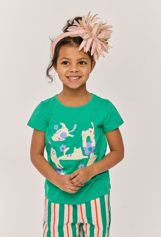Zielona koszulka dziewczęca z miękkim nadrukiem w kotki. Uszyta z 100% bawełny, jest przewiewna i przyjemna w dotyku, dzięki czemu sprawdza się przez cały dzień. Klasyczny fason pasuje do wielu stylizacji, świetnie wygląda z szortami, spódnicą i legginsami.
