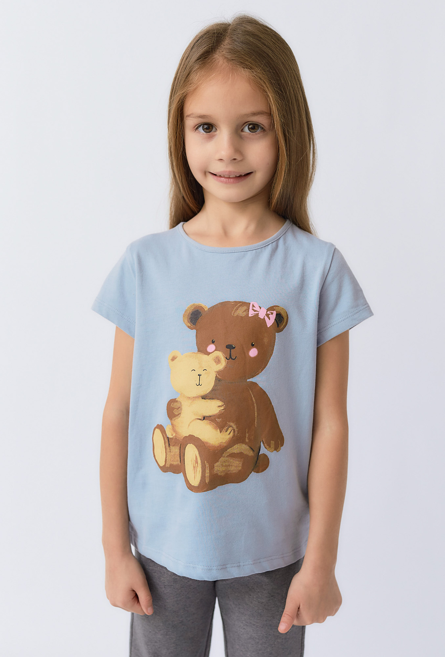 Urocza koszulka dziewczęca w kolorze pastelowego błękitu to doskonały wybór na każdy dzień. Wykonana z dzianiny bawełnianej, jest miękka, przyjemna w dotyku i przewiewna, idealna nawet dla wrażliwej skóry dziecka. Koszulkę zdobi słodki nadruk dwóch misiów, z których jeden ma różową kokardkę, co dodaje całości delikatnego i dziewczęcego uroku. Krój klasyczny, z krótkim rękawem i zaokrąglonym dołem- świetnie sprawdzi się zarówno do legginsów, jak i spodni dresowych.