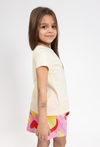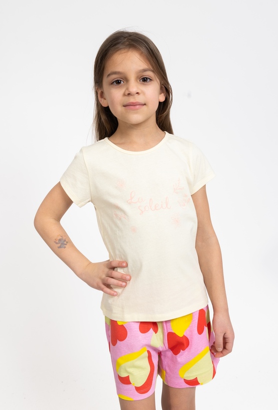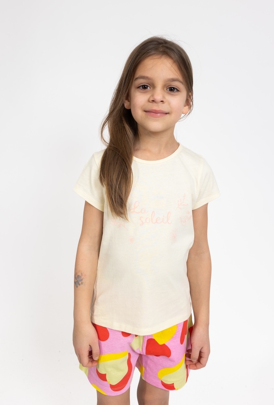 Koszulka z delikatnym nadrukiem to idealna propozycja na ciepłe dni, łącząca wygodę z uroczym, dziewczęcym stylem. Wykonana z miękkiej i przyjemnej w dotyku dzianiny, zapewnia pełen komfort noszenia przez cały dzień. Front koszulki zdobi delikatny nadruk w stonowanym, różowym kolorze. Pośrodku znajduje się subtelny napis „La soleil”, nawiązujący do słońca i lata, otoczony drobnymi, linearnymi motywami kwiatowymi oraz grafiką przedstawiającą ptaszka. Koszulka ma klasyczny, wygodny krój z krótkim rękawem i okrągłym dekoltem wykończonym wąską lamówką. Dzięki swojemu uniwersalnemu charakterowi, doskonale komponuje się zarówno z szortami, jak i spódniczkami czy spodniami, tworząc gotowy, wakacyjny look.